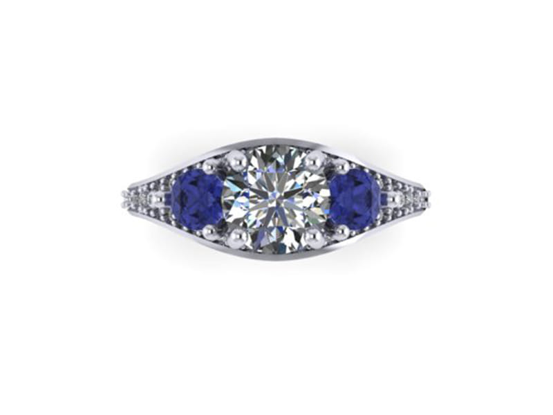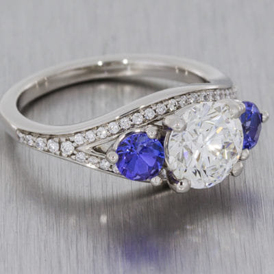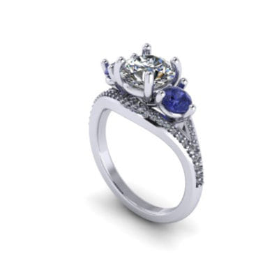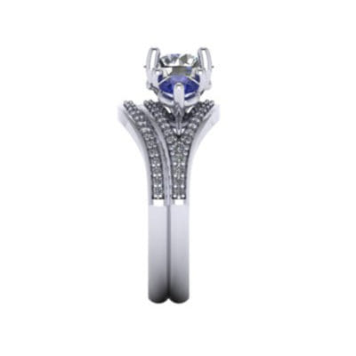 This stunning engagement and wedding ring set features an incredible 1.35ct diamond with contrasting round tanzanites on either side. Both bands are diamond set to match each other perfectly.