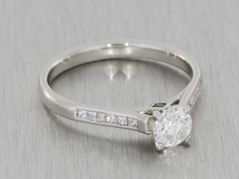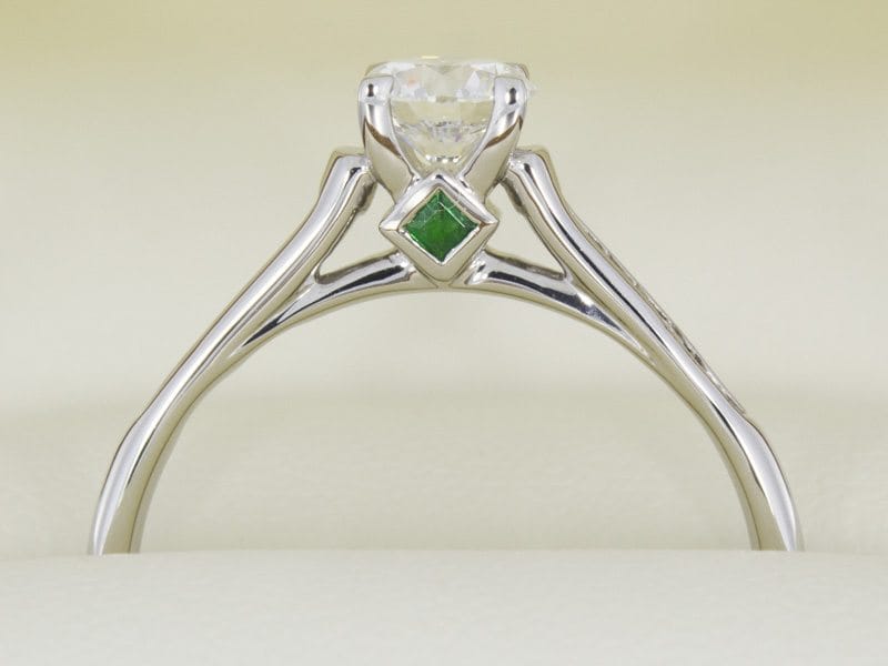 This contemporary Solitaire cathedral ring featuring princess cut emerald peek stones. Created in platinum with a beautiful centre brilliant round diamond, the contemporary shank has been channel prong set with accent diamonds to add to this contemporary classic design.
