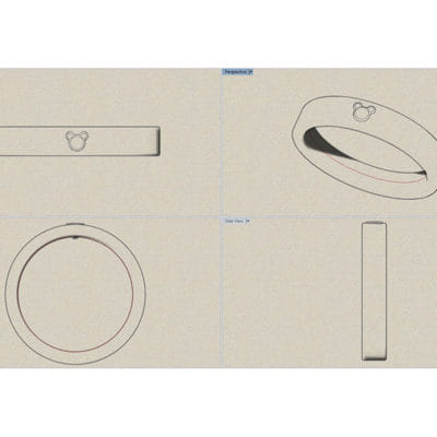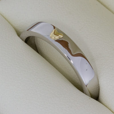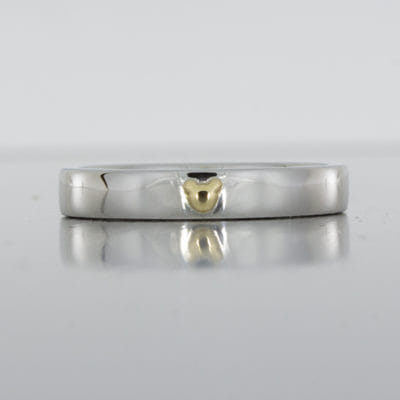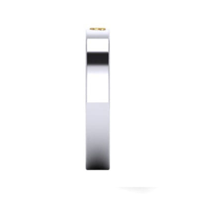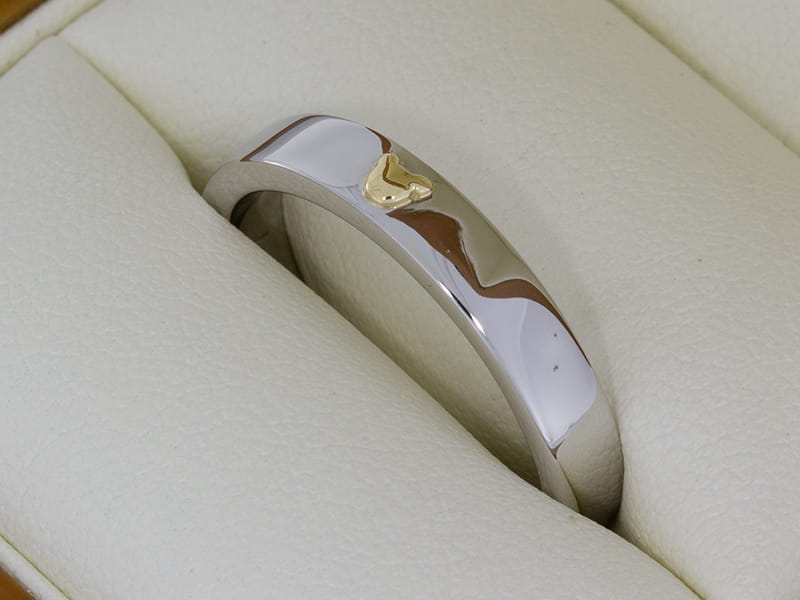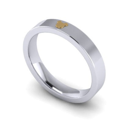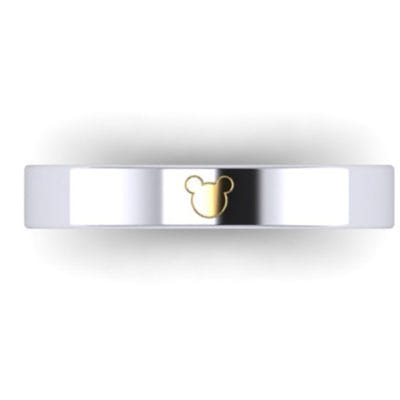 This contemporary gents engagement ring is made in a polished platinum metal with a soft square profiling. The ring is completed with a yellow gold Mickey mouse adding a unique personal touch