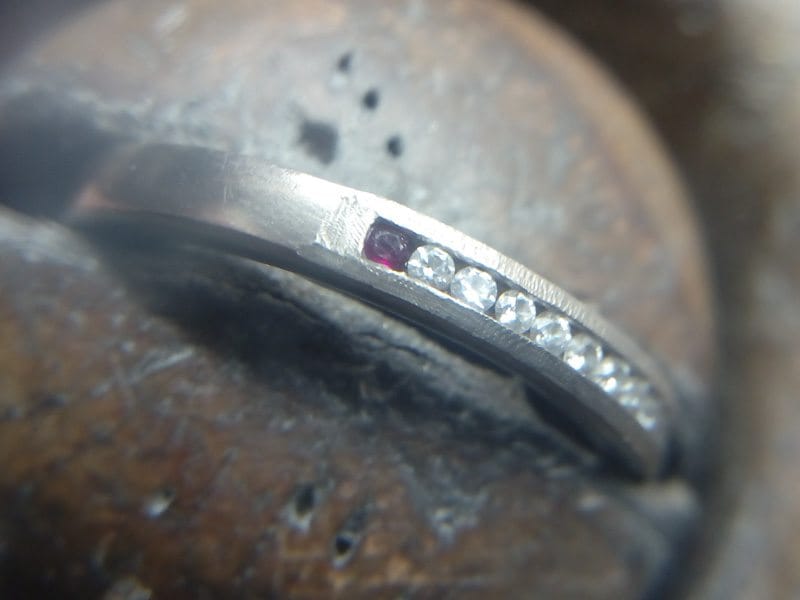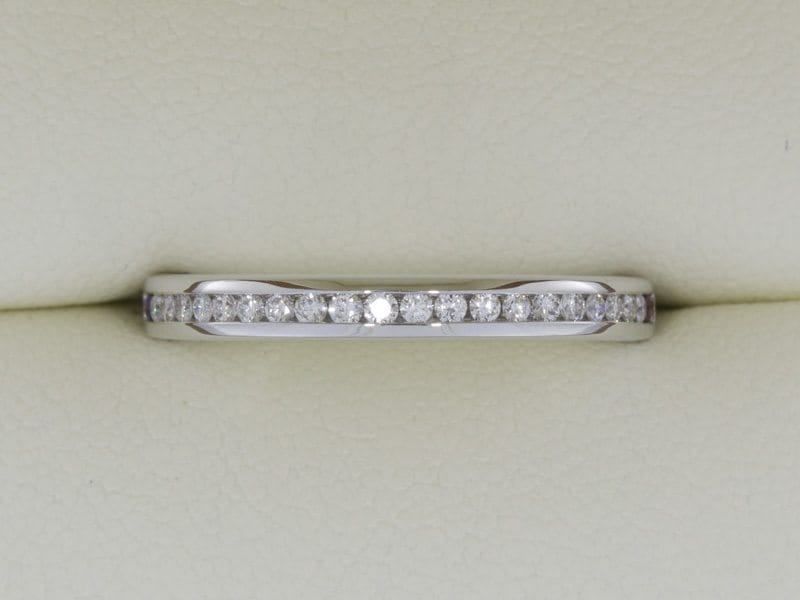 Here we have a classic and always beautiful diamond and platinum half eternity band with channel set diamonds with a few personal additions of a ruby and amethyst at the ends of the channel. Creating a half eternity ring has the advantage of being “future friendly” allowing easy resizing over the course of time. This 18kt white gold ring was a very special commission, symbolising a story of powerful personal significance, it was our pleasure to be able to create this meaningful ring.