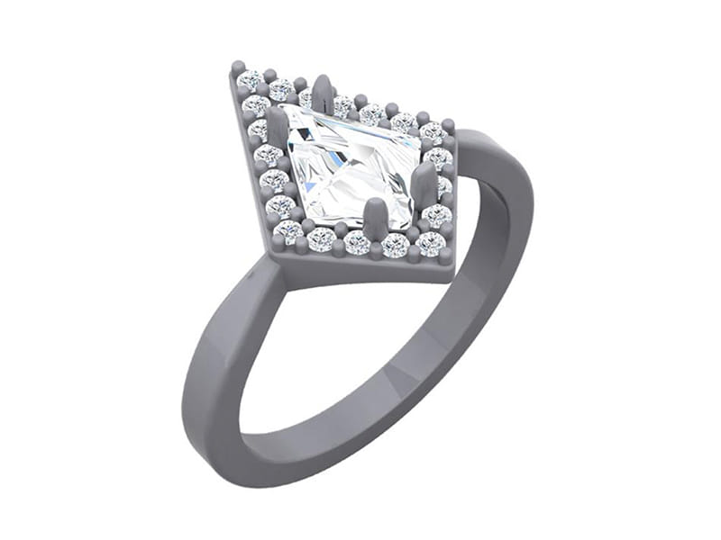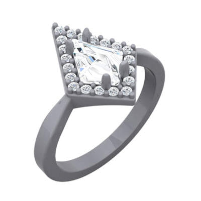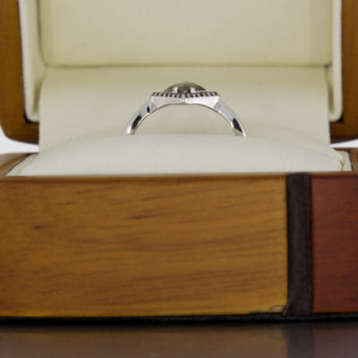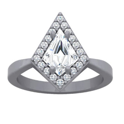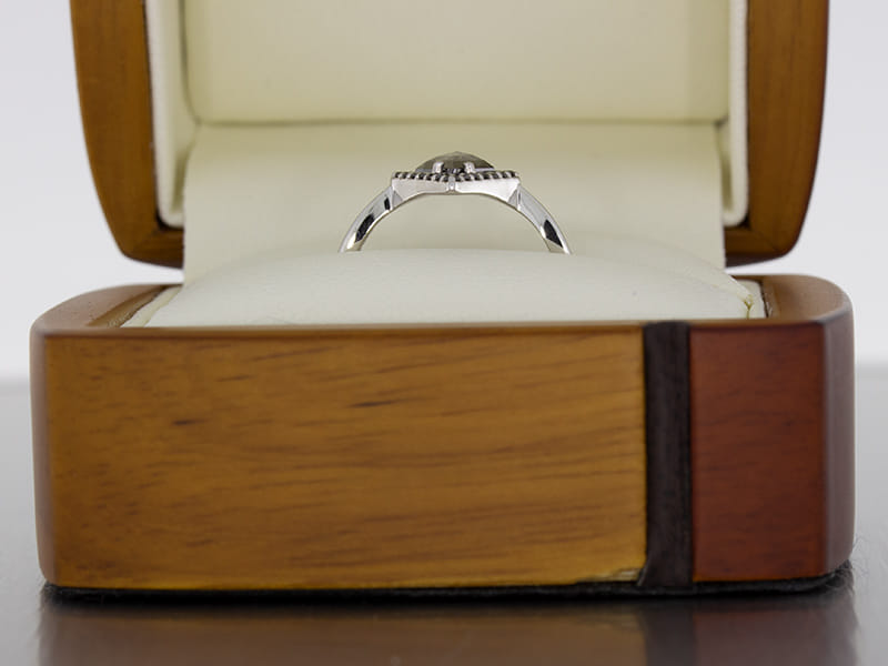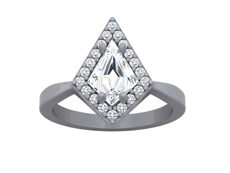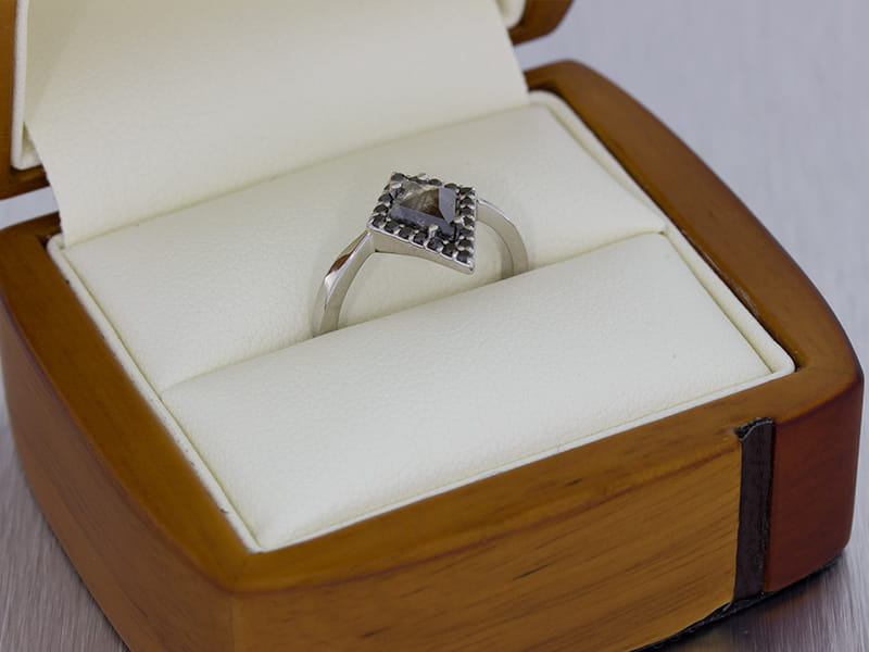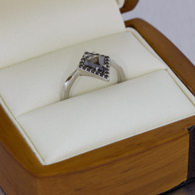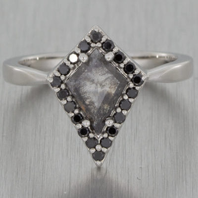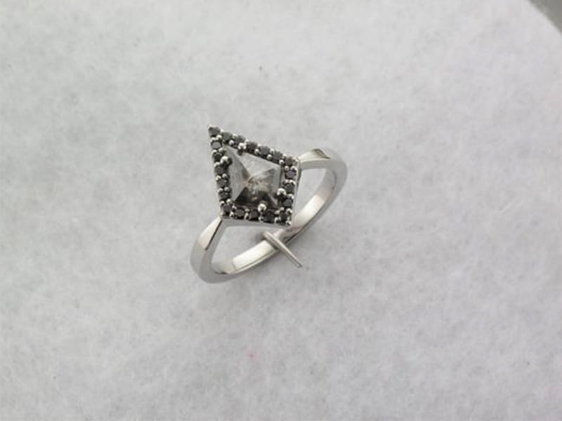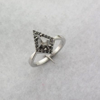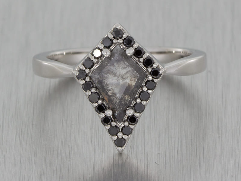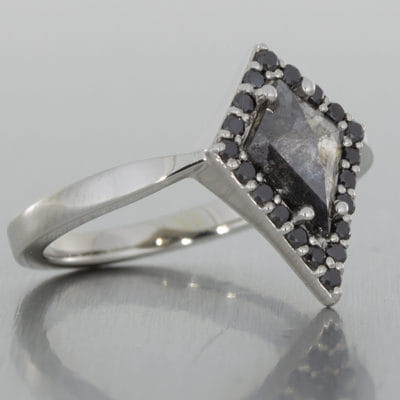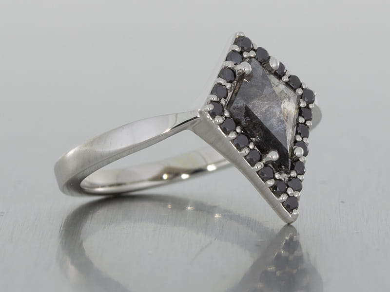 This Platinum ring features a unique kite shaped salt and pepper diamond which is beautifully framed with black round diamonds.