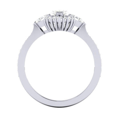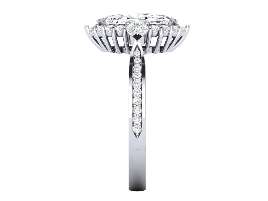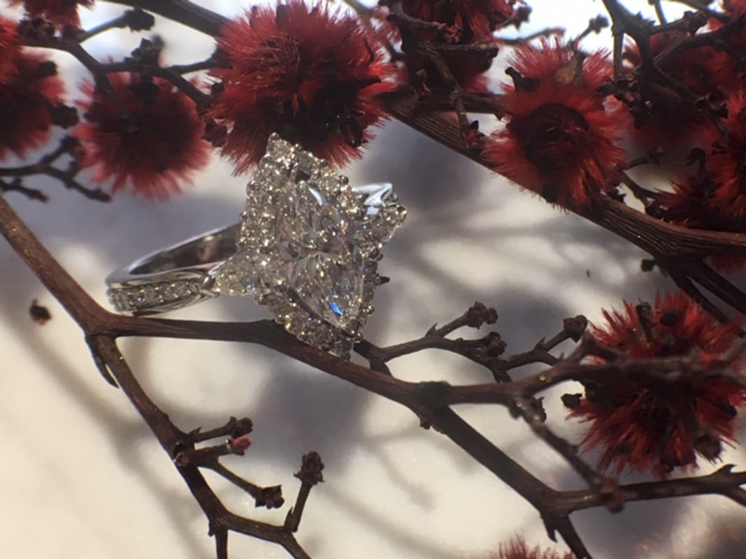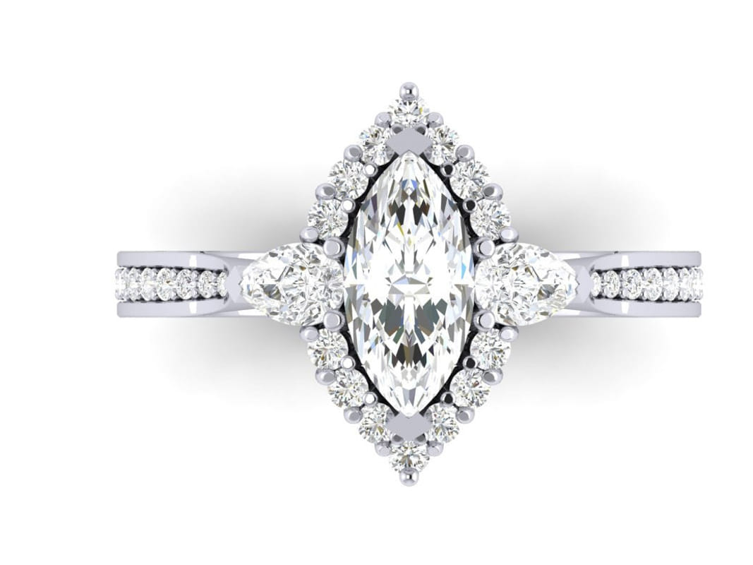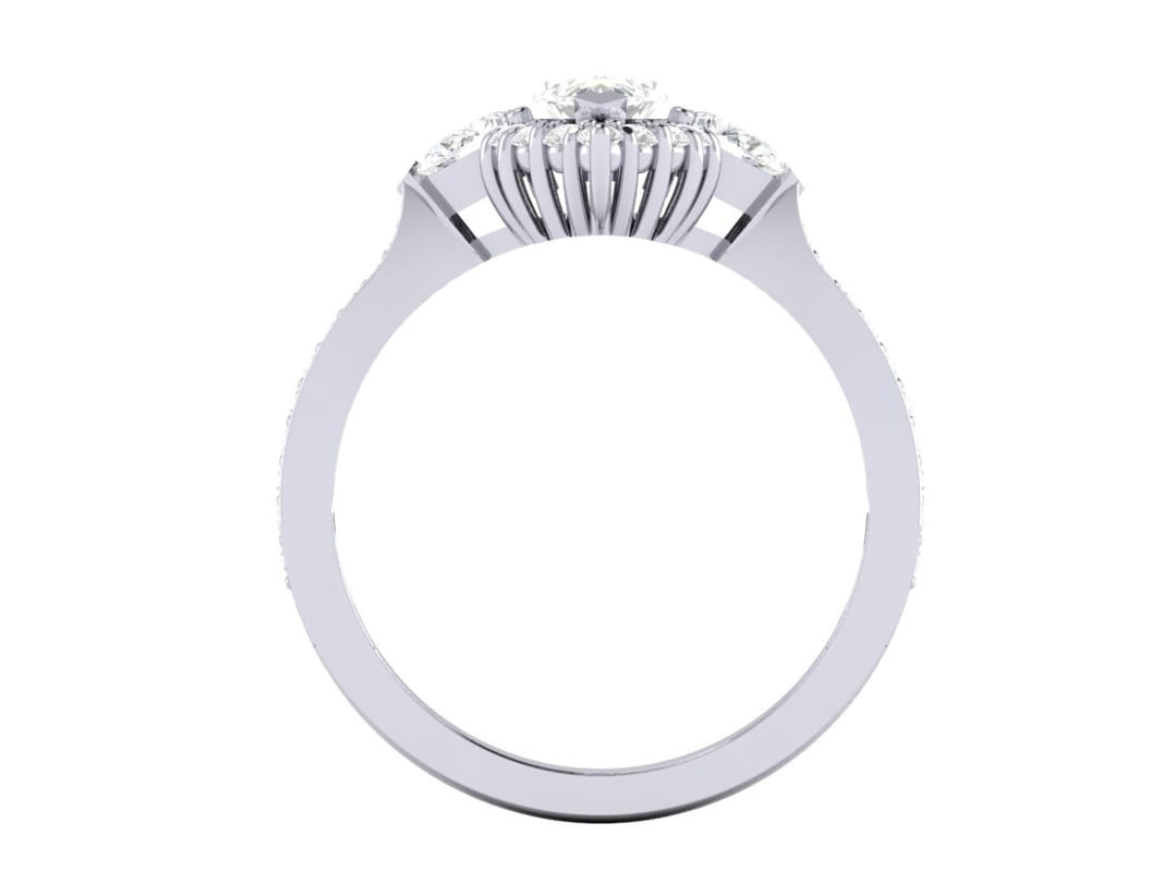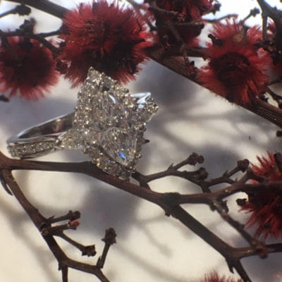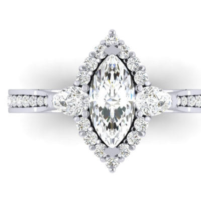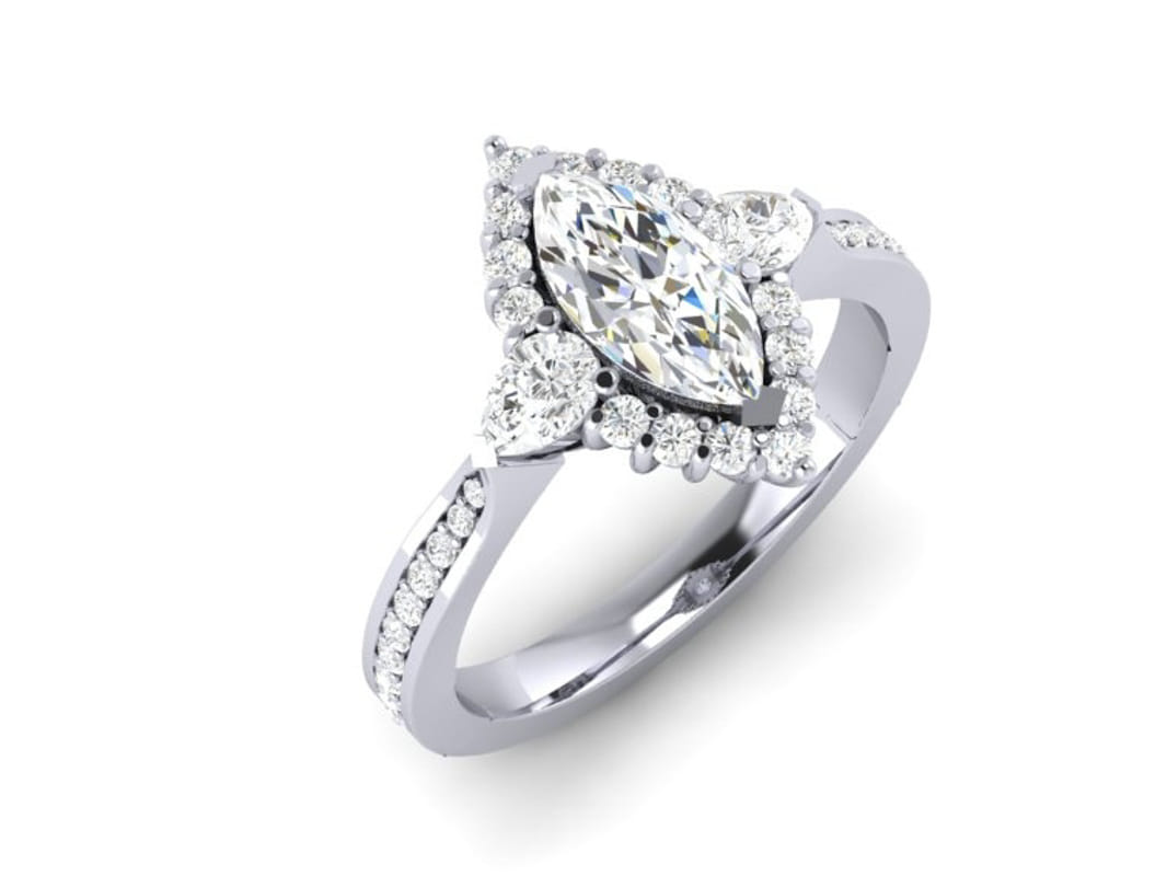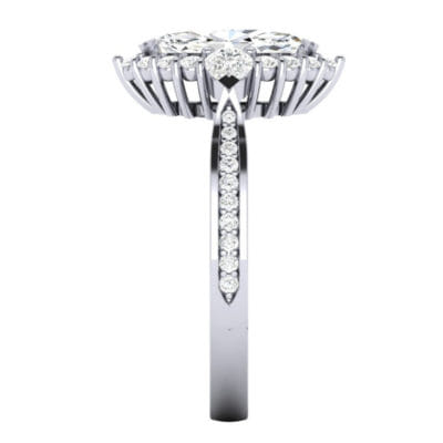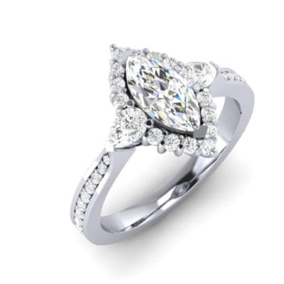 The remarkable marquise centre of this ring is framed by a beautiful flow of fancy shaped diamonds, creating a truly spectacular piece. The ring has been finished with grain set diamond shoulders.