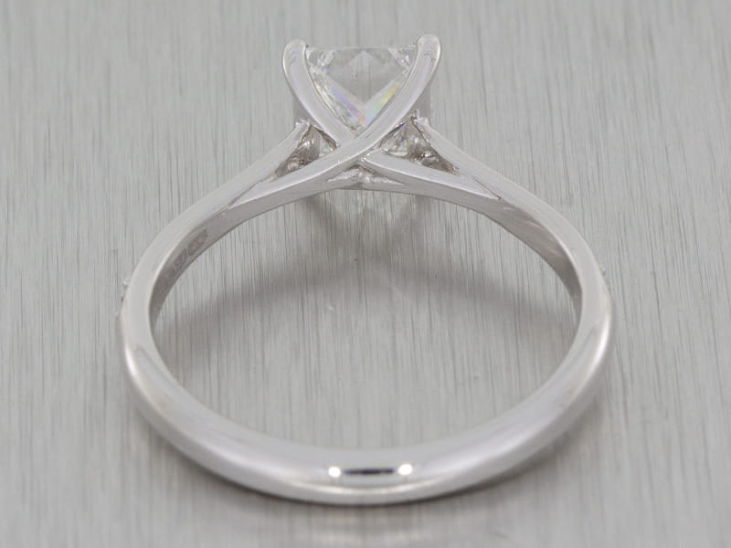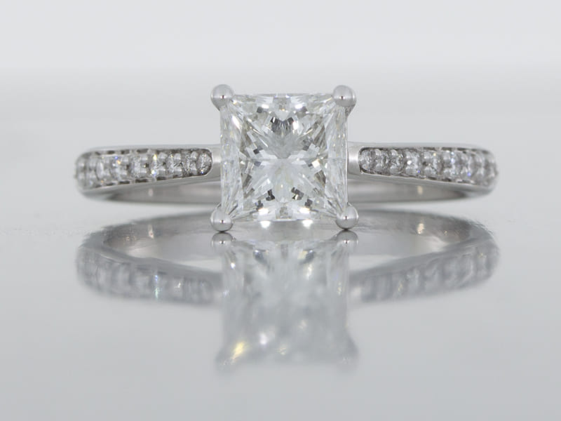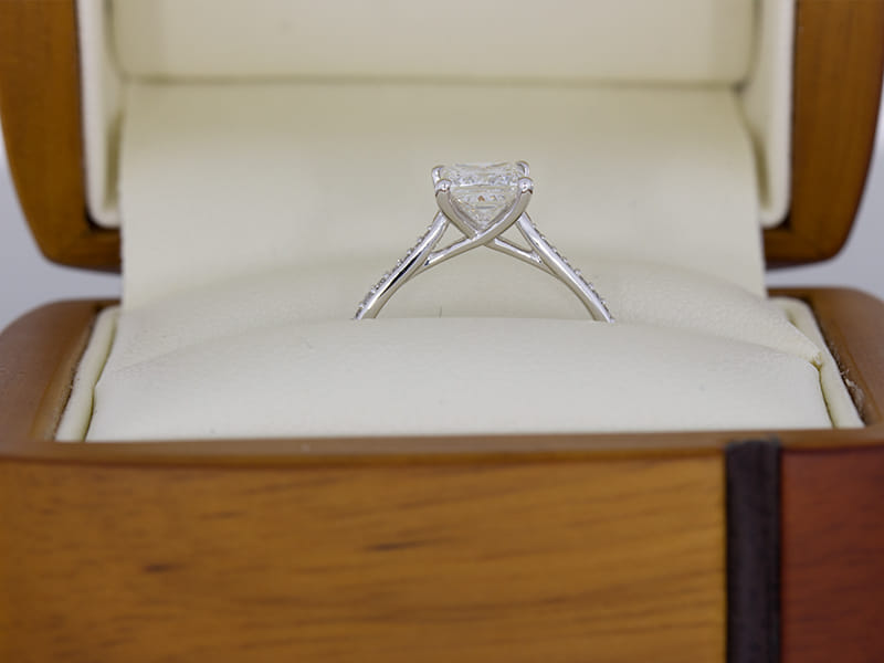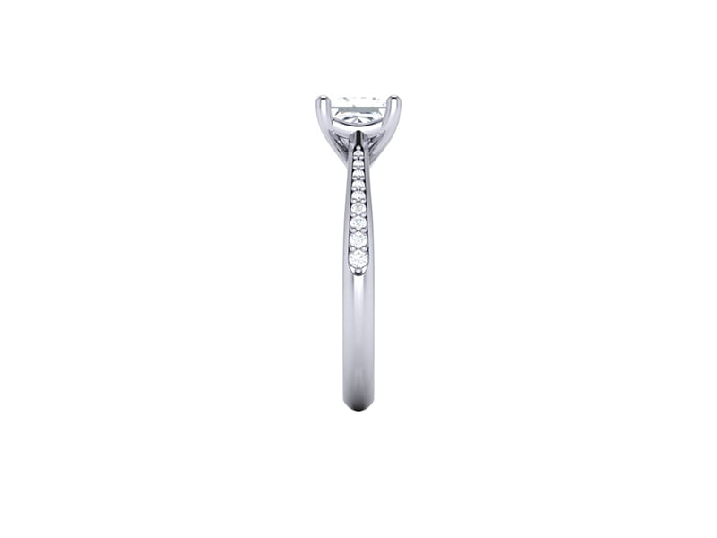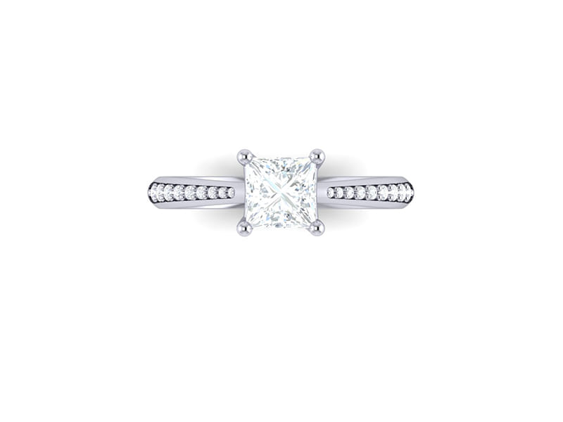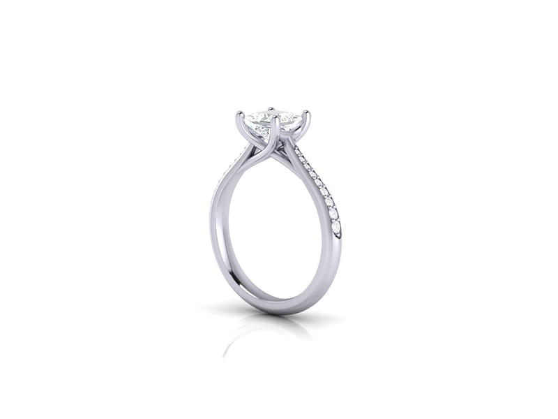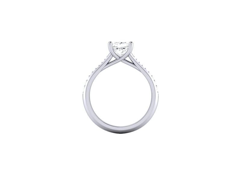 This modern take on the traditional solitaire ring, houses at its centre a beautiful princess cut diamond nestled in fine wire work. Accented by a clean diamond pave set shoulder cathedral band.