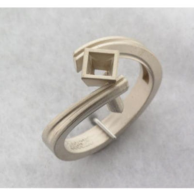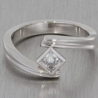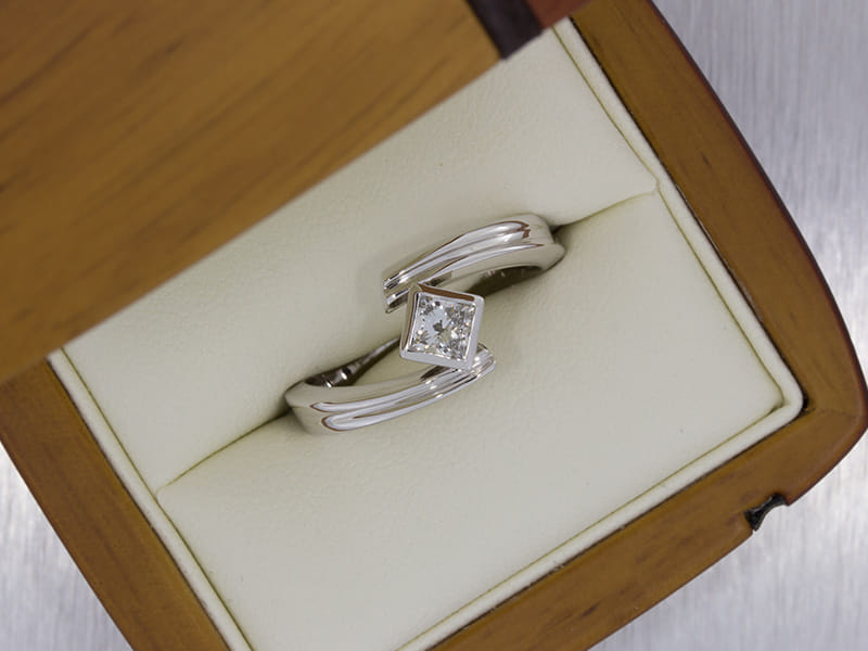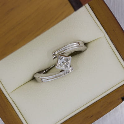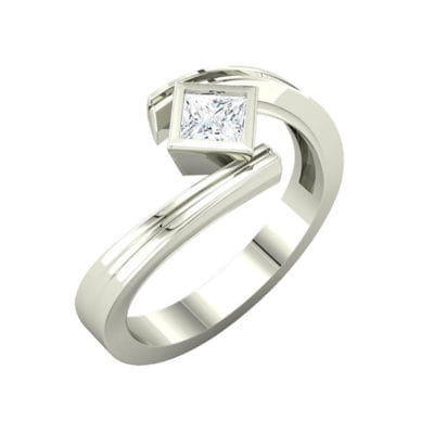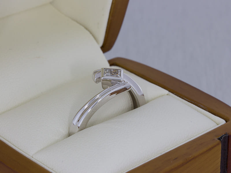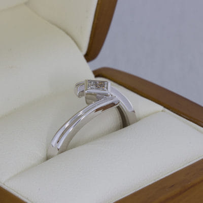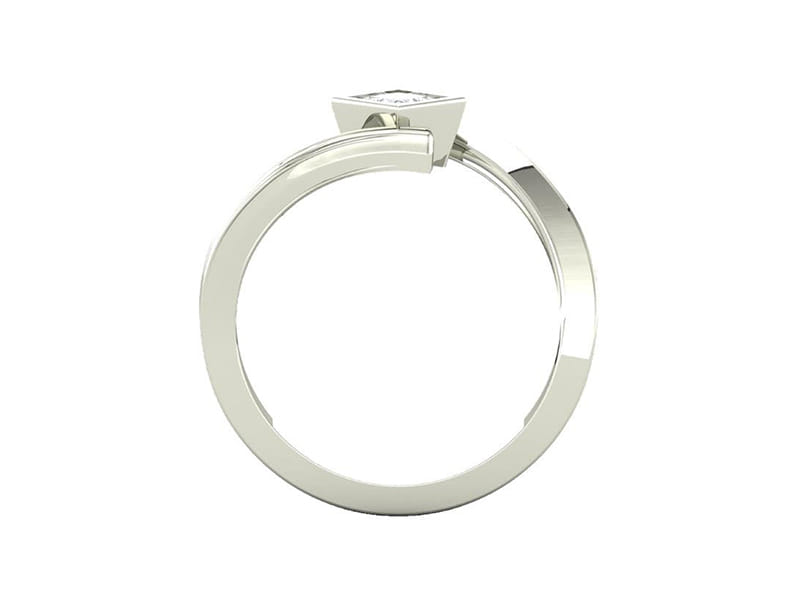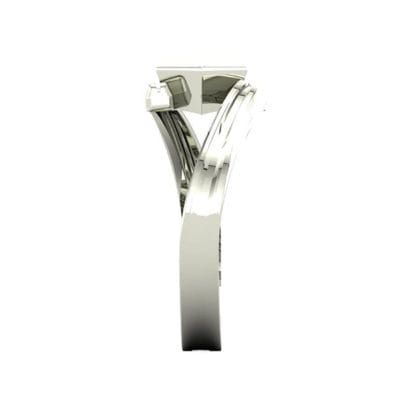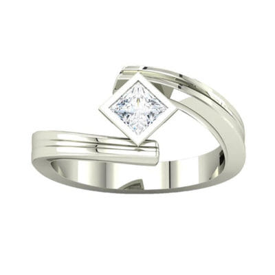 The design of this ring breaks the boundaries of what a Gents engagement ring should be. This contemporary and beauteous ring features a fiery princess cut diamond housed in a grooved bypass shank. The ring has been complimented by a polished finish.