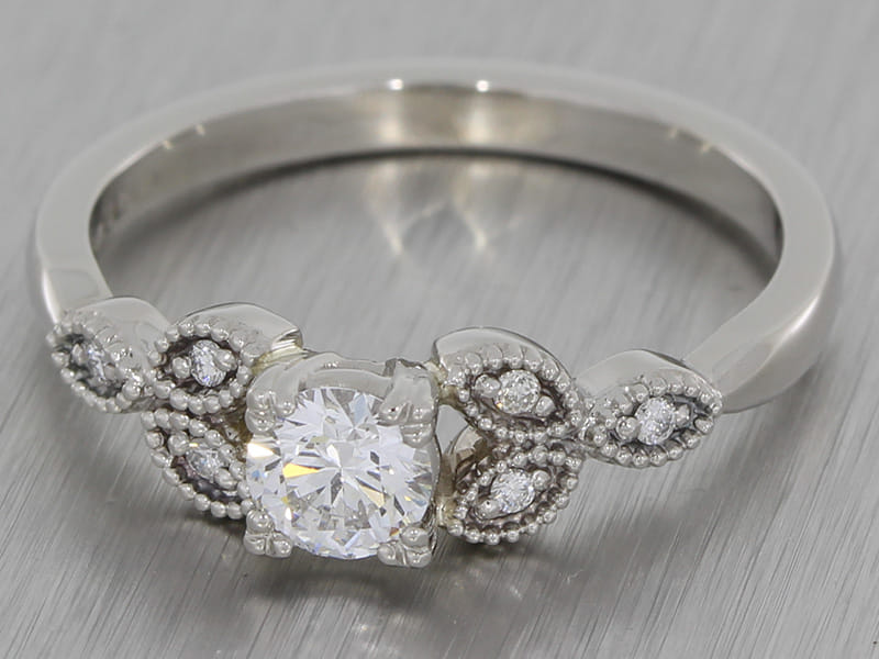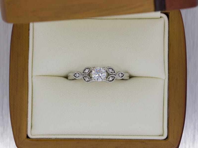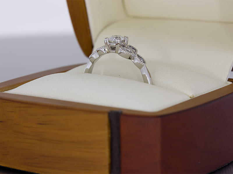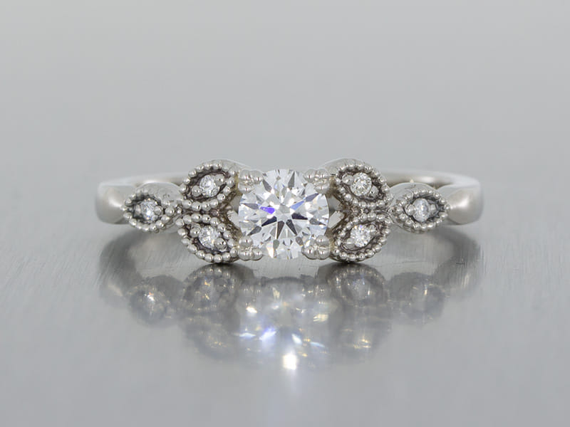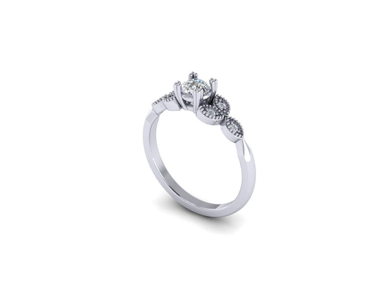 A unique centre crafted by infinity diamond accented beautifully with marquise shaped elements pave set with round brilliant cut diamonds. Finished with milegrain edging.