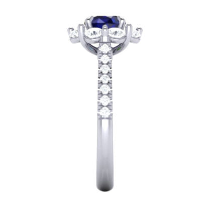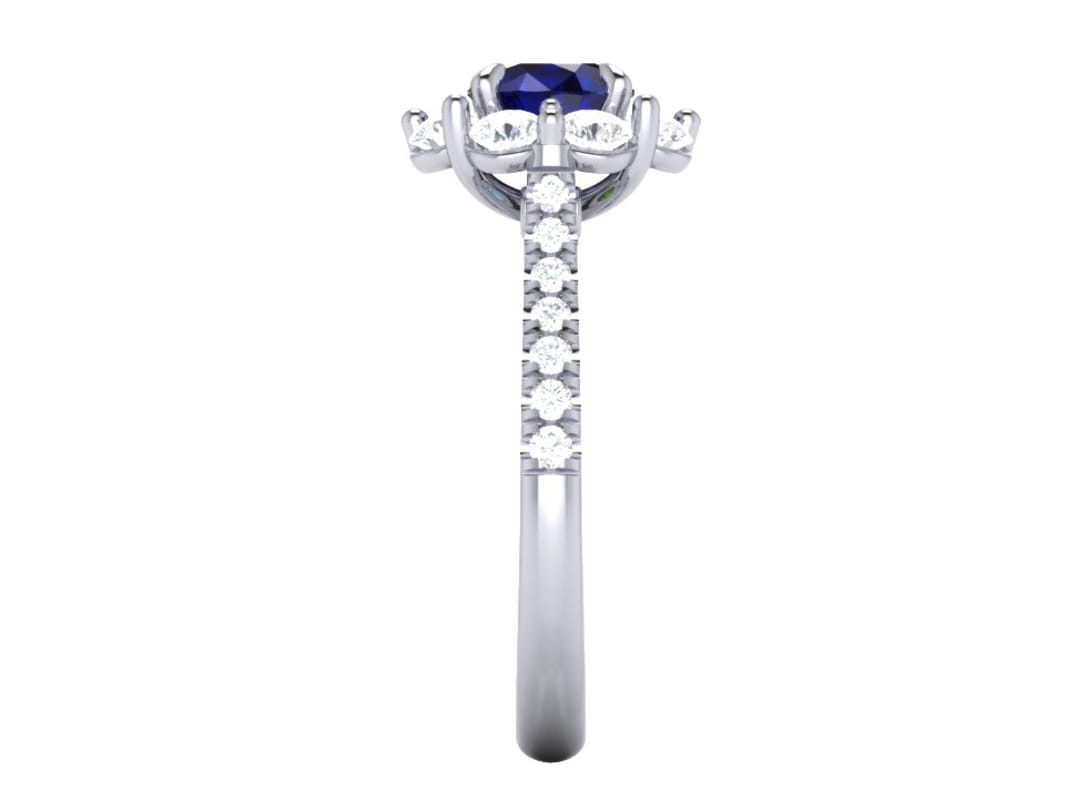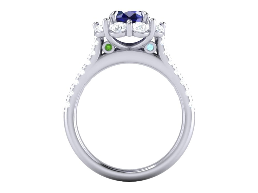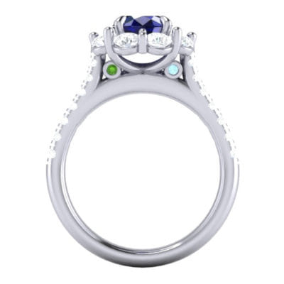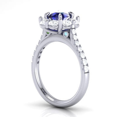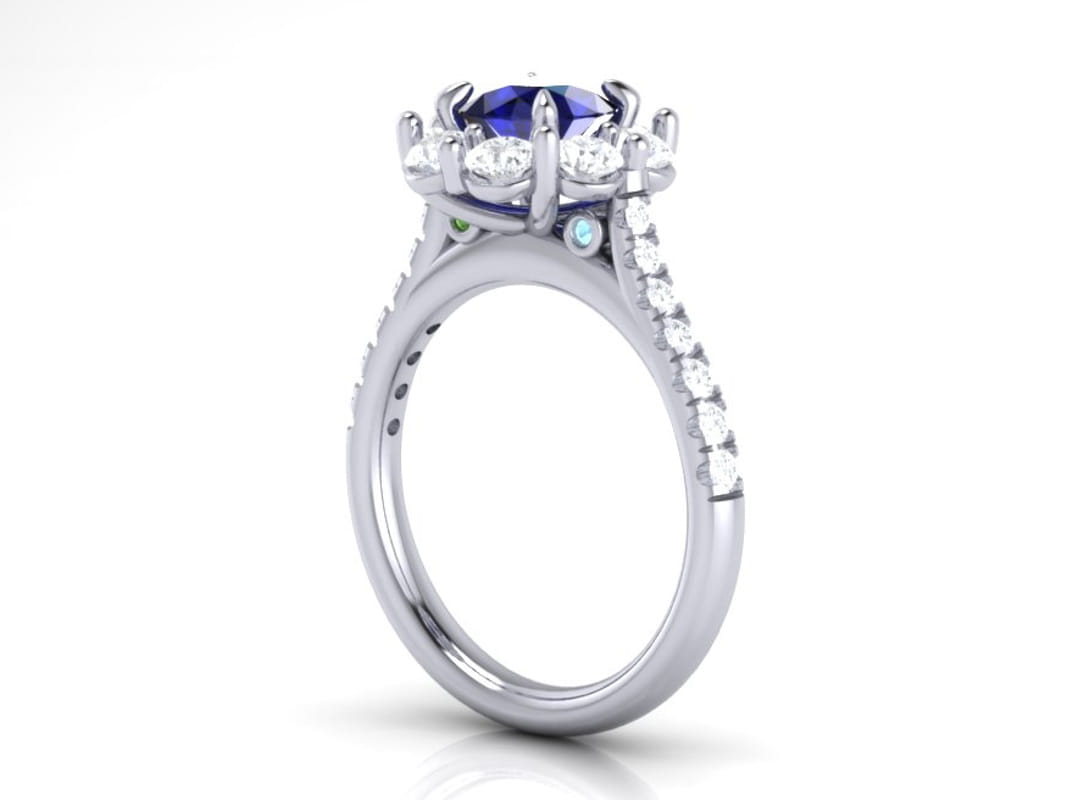This ring features a beautful blue sapphire with deep green hues. The sapphire is accentuated with sparkling round brilliant diamonds around the halo and on the shoulders, creating a vintage floral feel. There is a further splash of colour on the underside of the ring with two bezal set tsavorite garnets and Aquamrines.