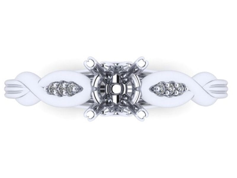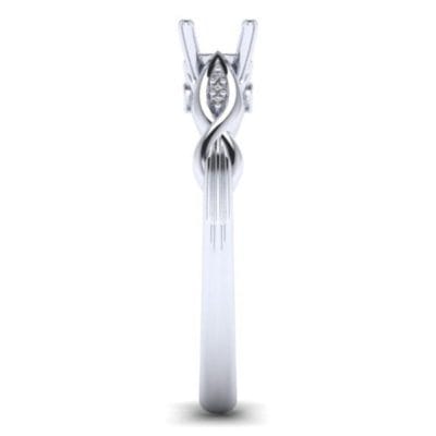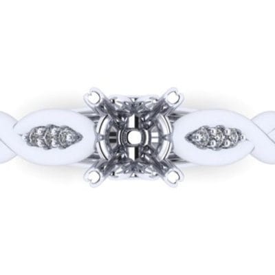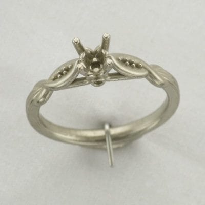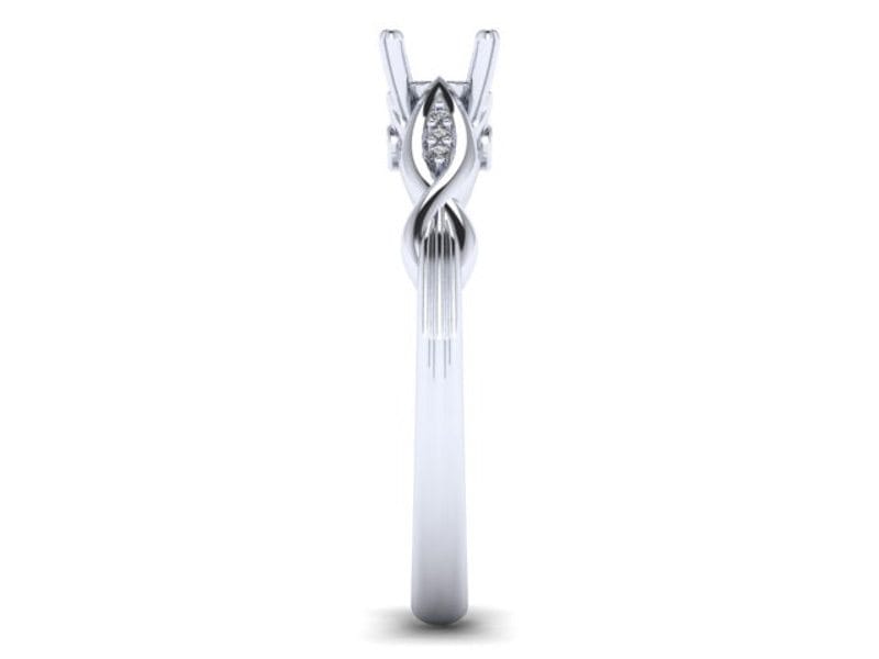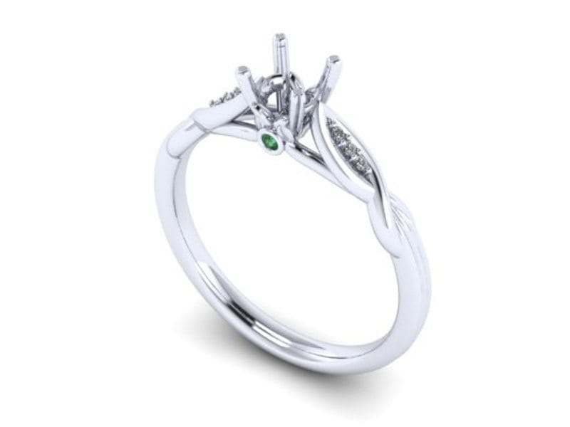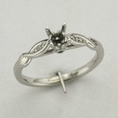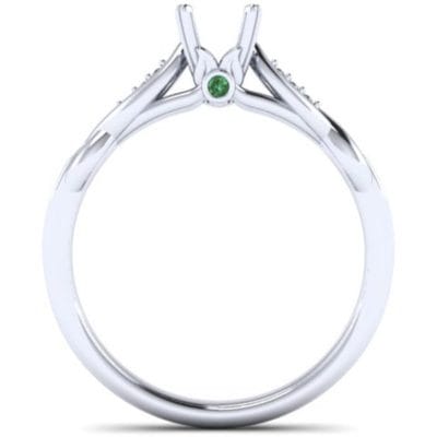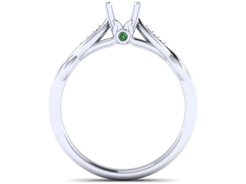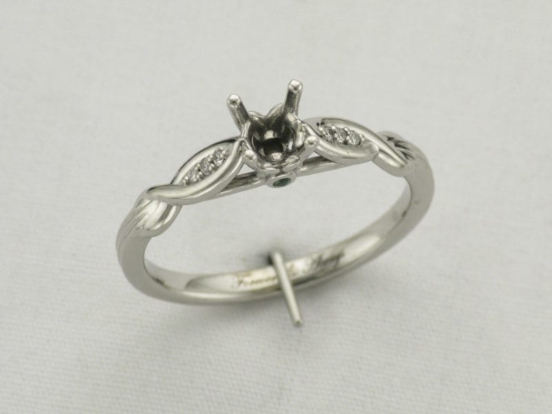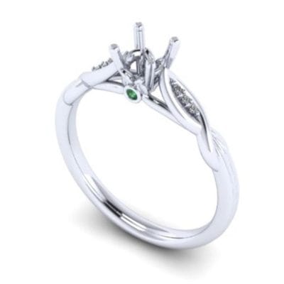 This unusual custom platinum engagement ring features a sculpted plait that tapers into the centre diamond setting using small accent diamonds in the crossover of the band. Additional genuine emerald peek stones were set underneath the central setting.