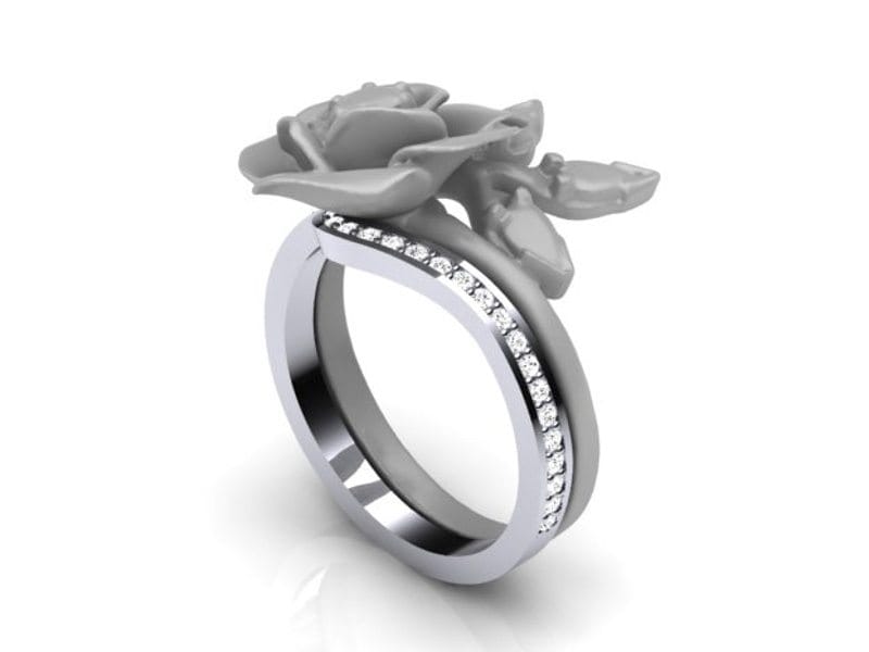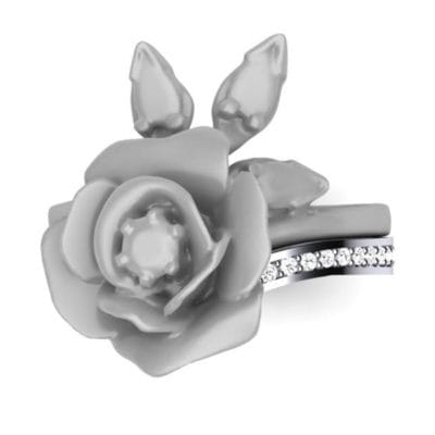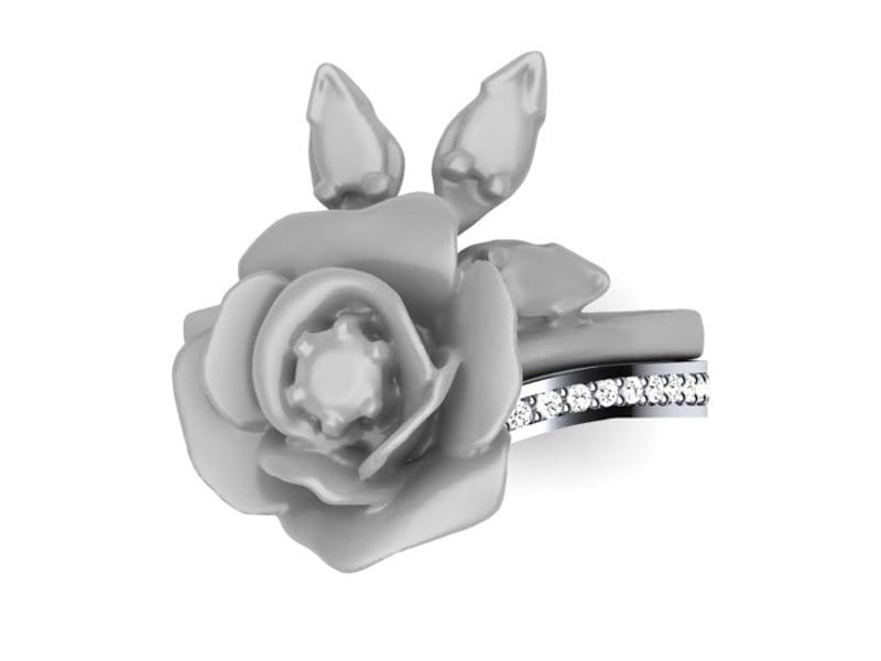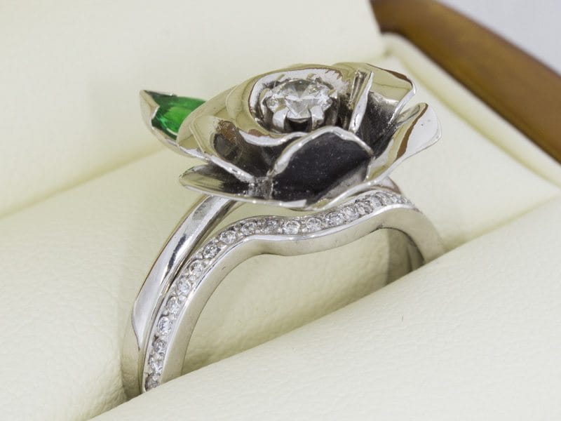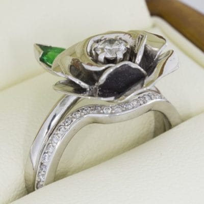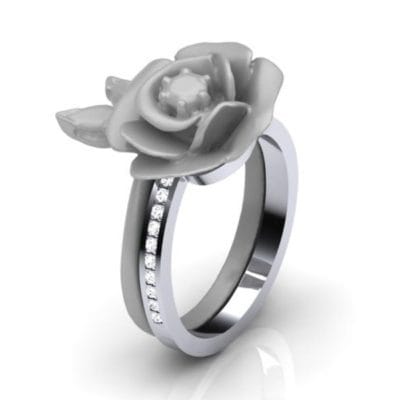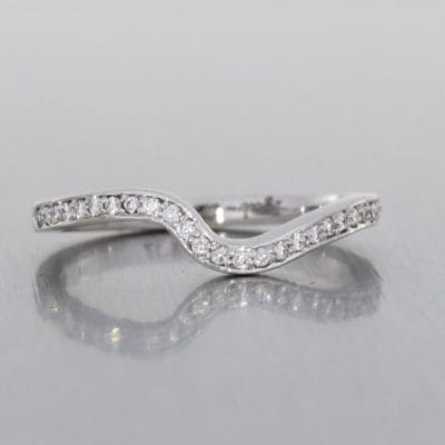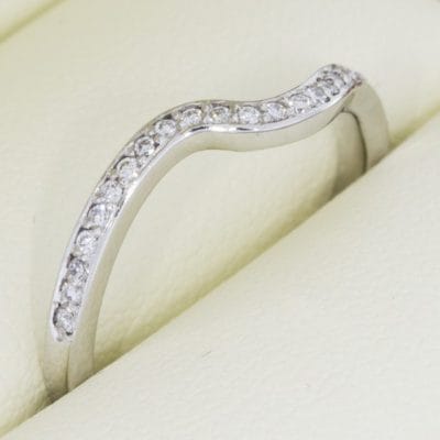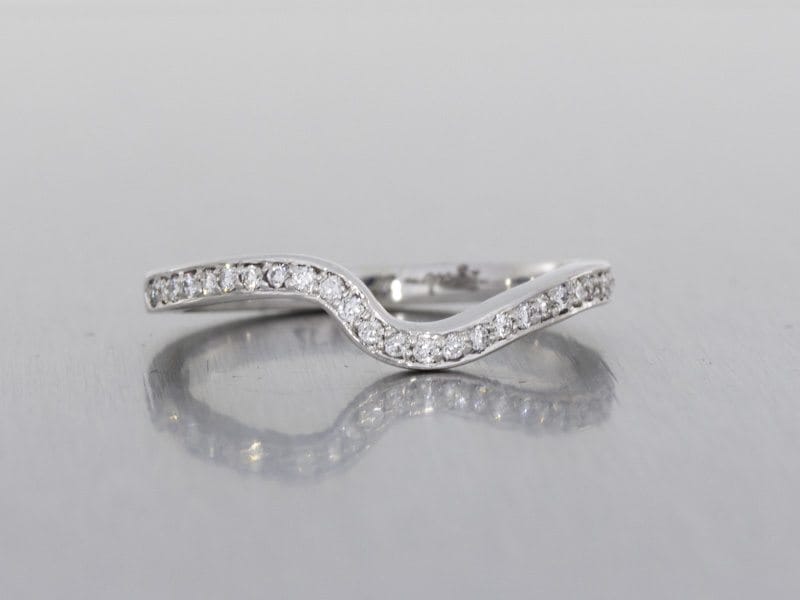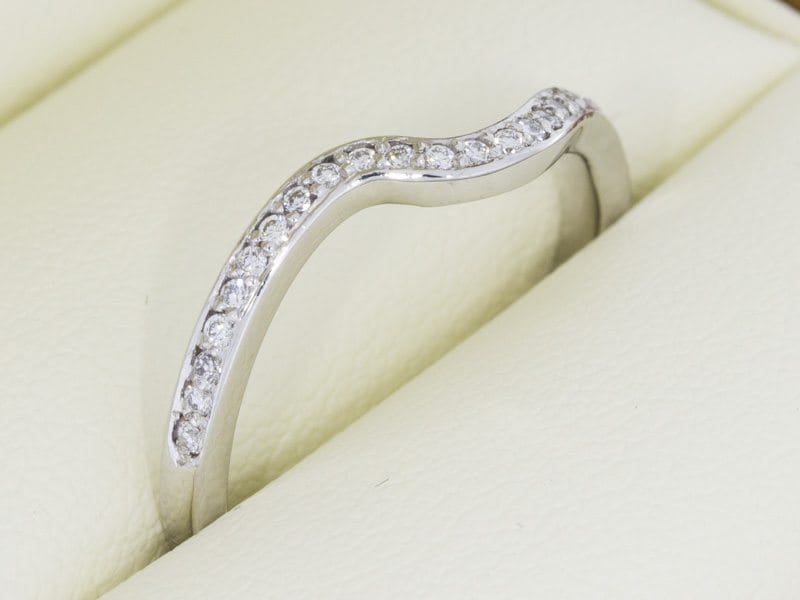 A smooth channel set band set with sparkling round brilliant diamonds. The band has been beautifully sculpted around a striking floral engagement ring.