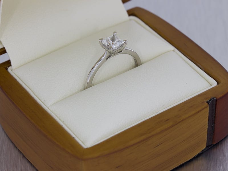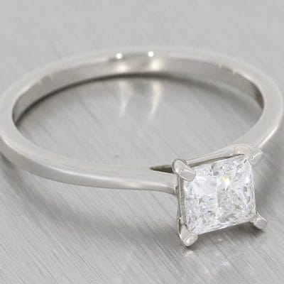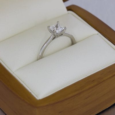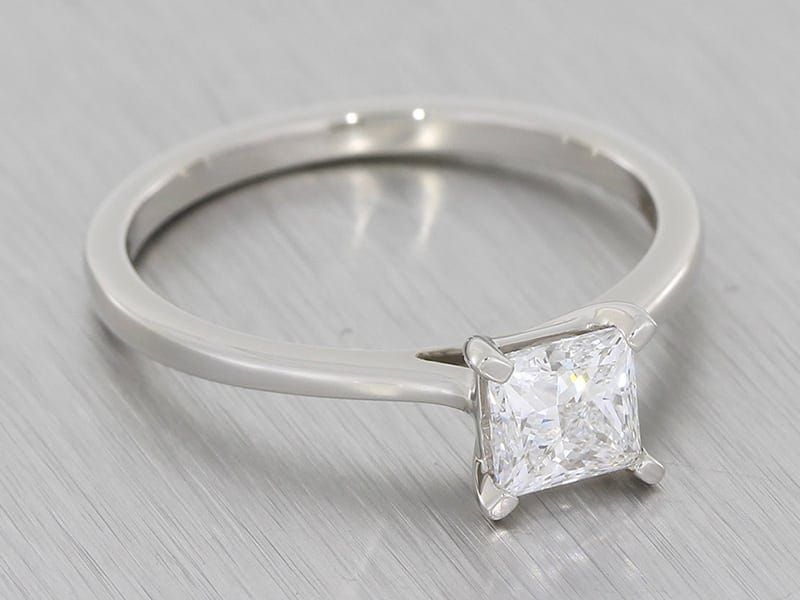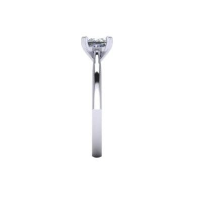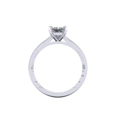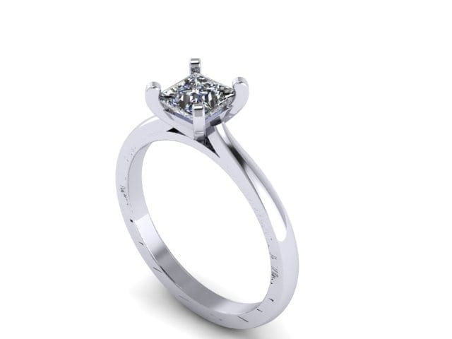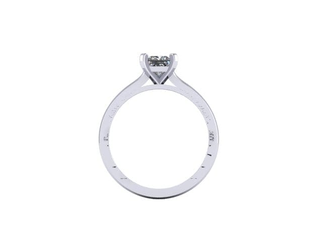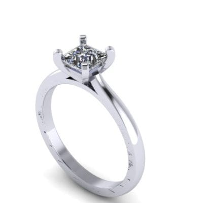 A classic and elegant design, created in platinum featuring a 0.75ct princess cut diamond. The profile of the band is copied on the shape of the claws creating continuity in this unique design.