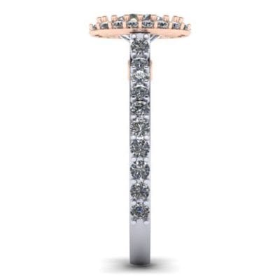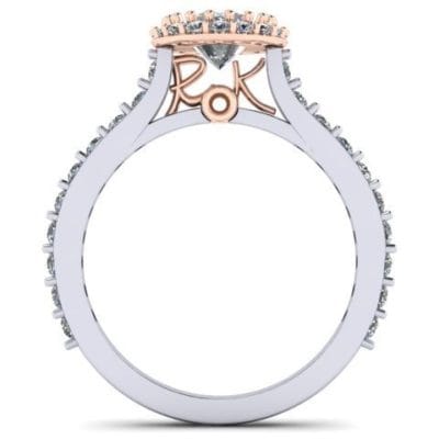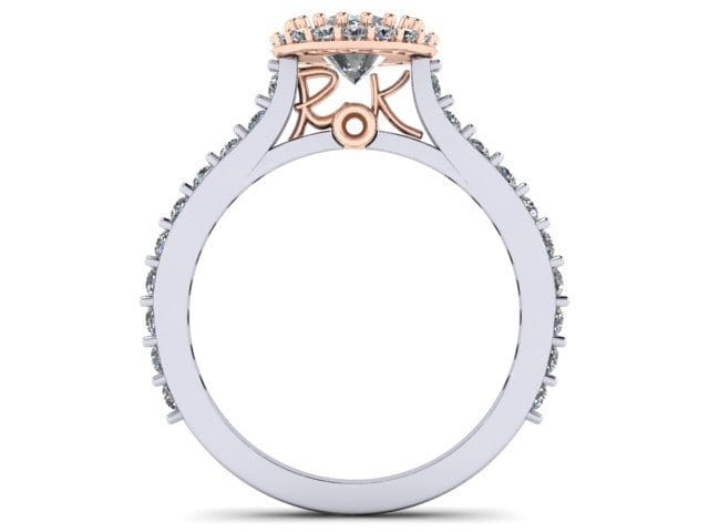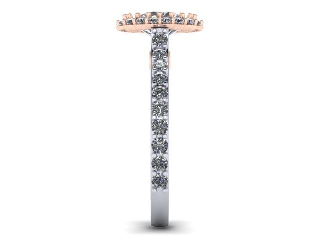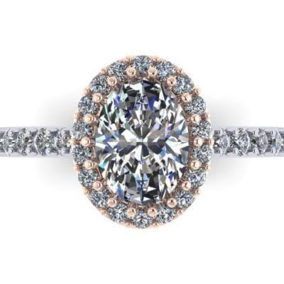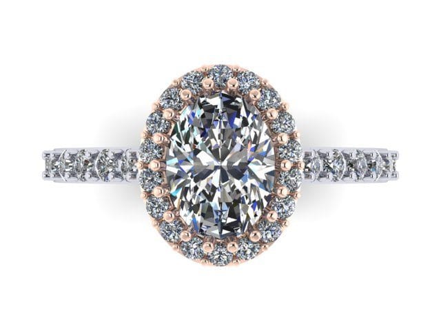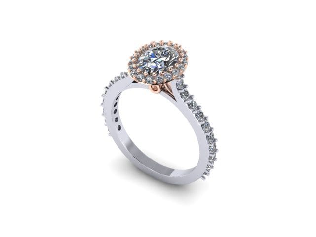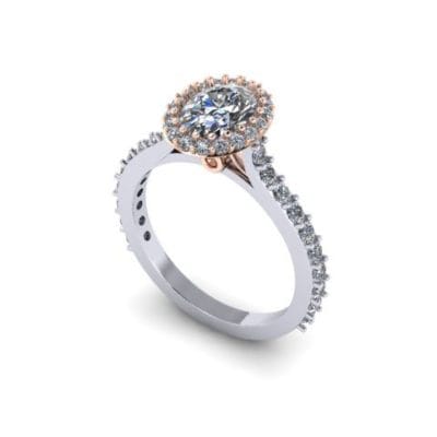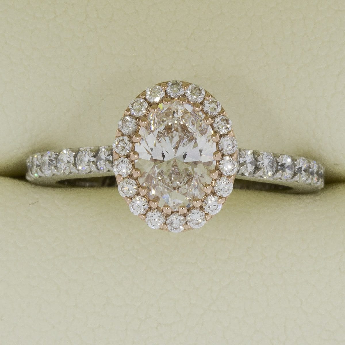 Our client for this week’s ‘Ring of the Week’ requested a platinum and rose gold mixed metal engagement ring. The beautiful rose gold and diamond halo envelops the oval cut diamond centre stone in an unusual shared prong setting. The surface prong set accent diamonds offer a dramatic yet romantic feel to the ring. The tanzanite peak stones are bezel set under the centre stone showing the client's initials on either side of the cathedral setting adding sentimental & personal value to this custom made ring.