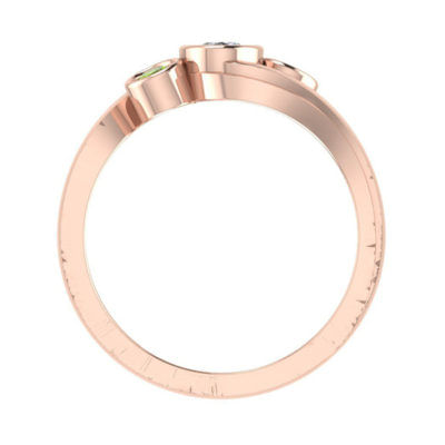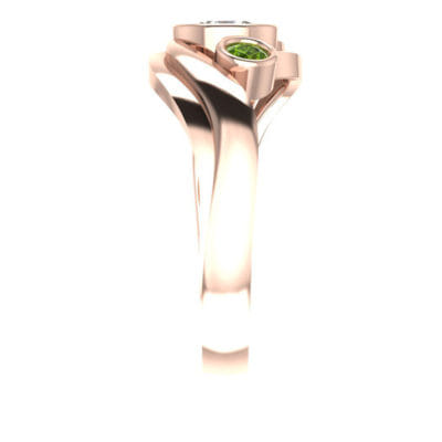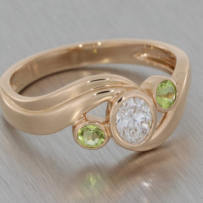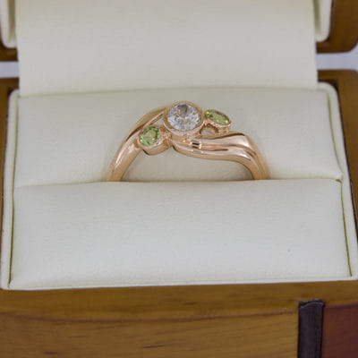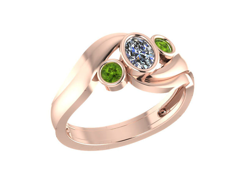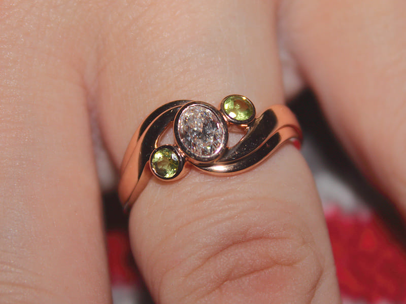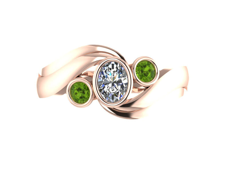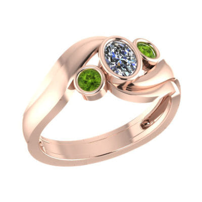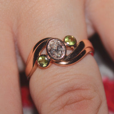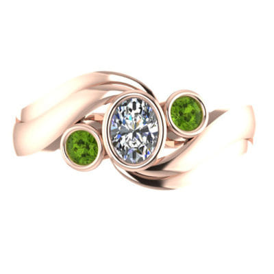 This Rose gold engagement ring features a beautiful oval diamond in the centre and is accented with round light green peridot. The stones are framed in a stunningly organic swirl design and sits comfortably flush on the finger.