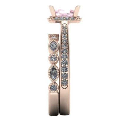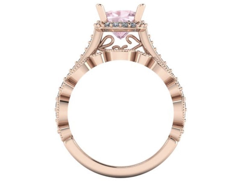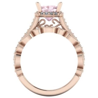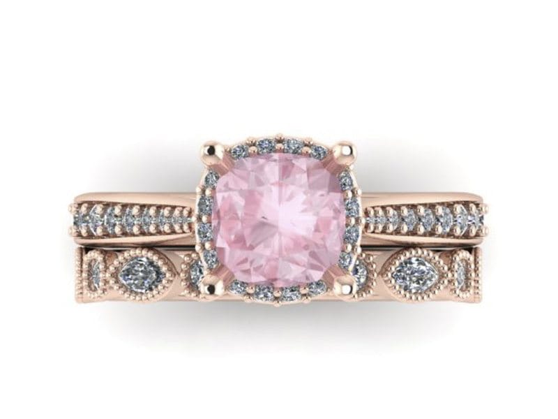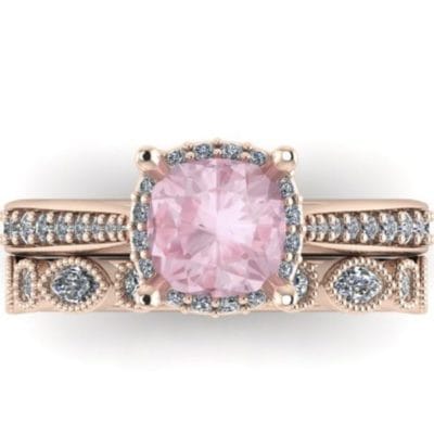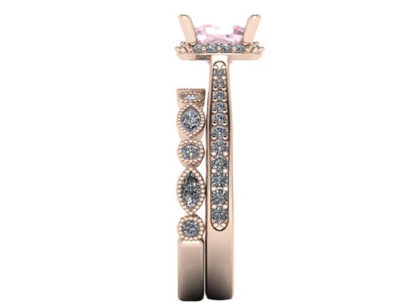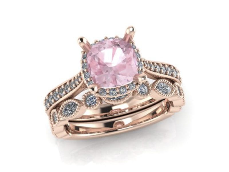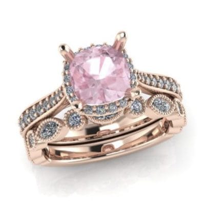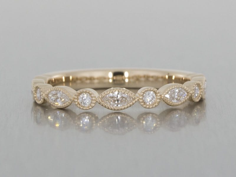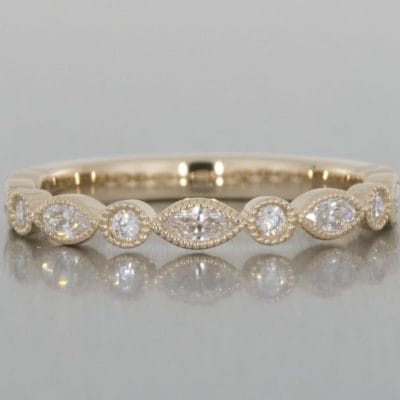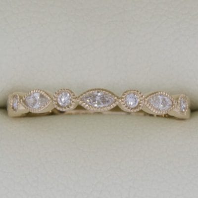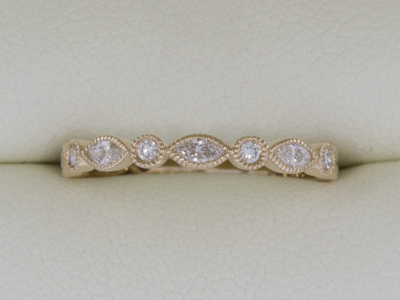 This pretty vintage style wedding band was designed to create a set from an existing engagement ring we made featuring a cushion cut morganite. The vintage style was carried through using millgrain and cushion shaped setting for the small round stones. A combination of marquise and round diamonds finishes this wedding band perfectly.