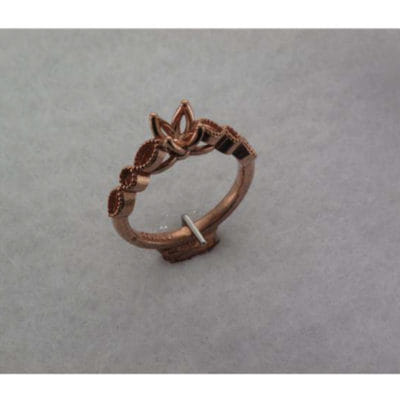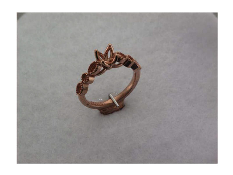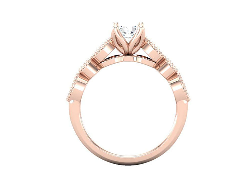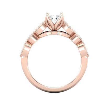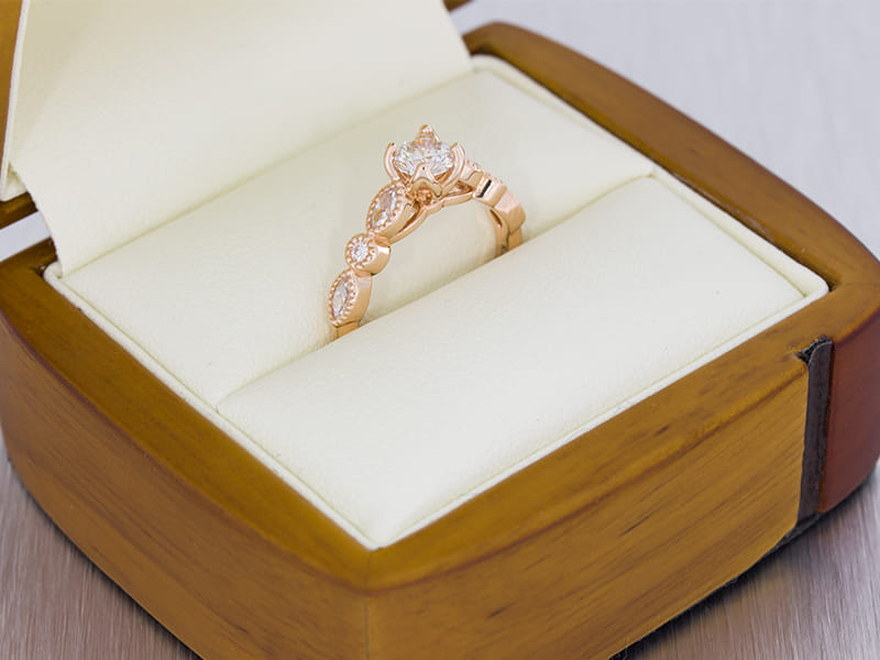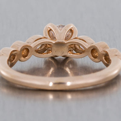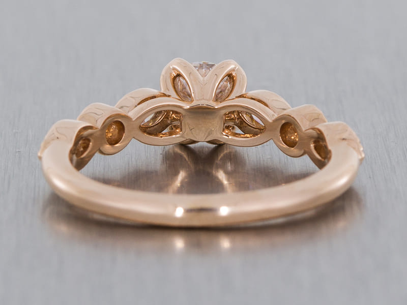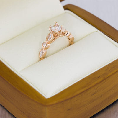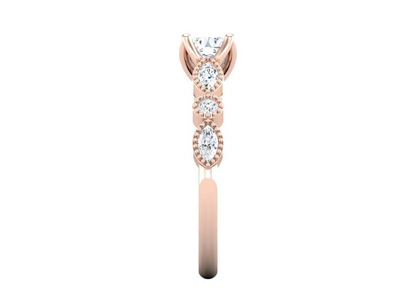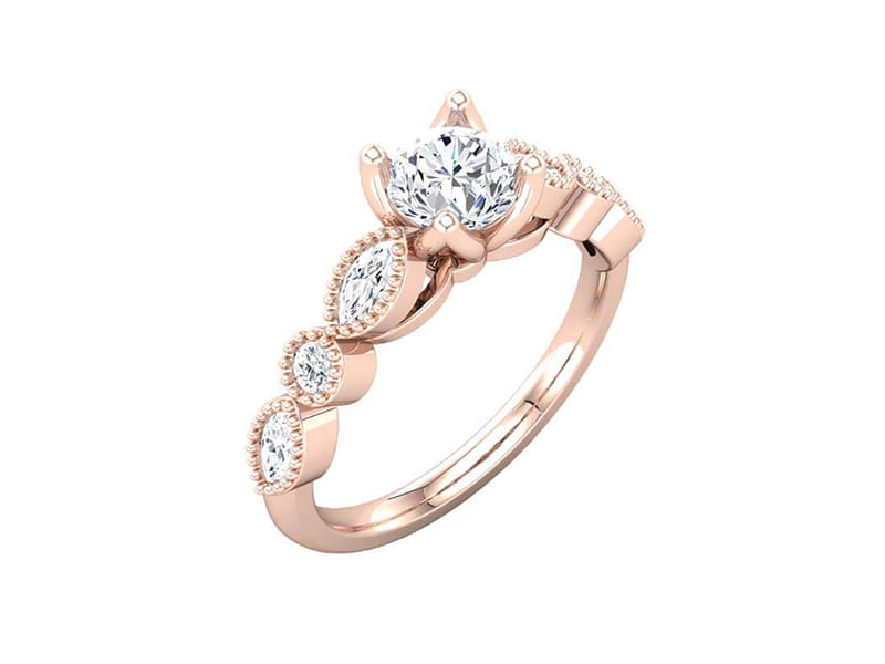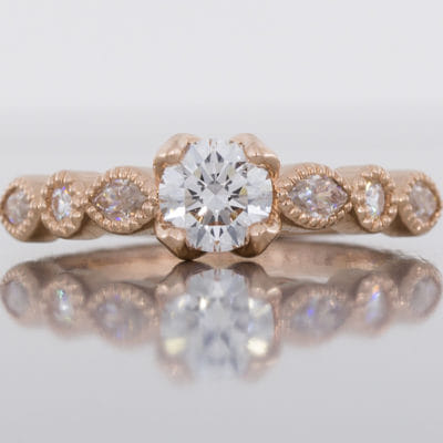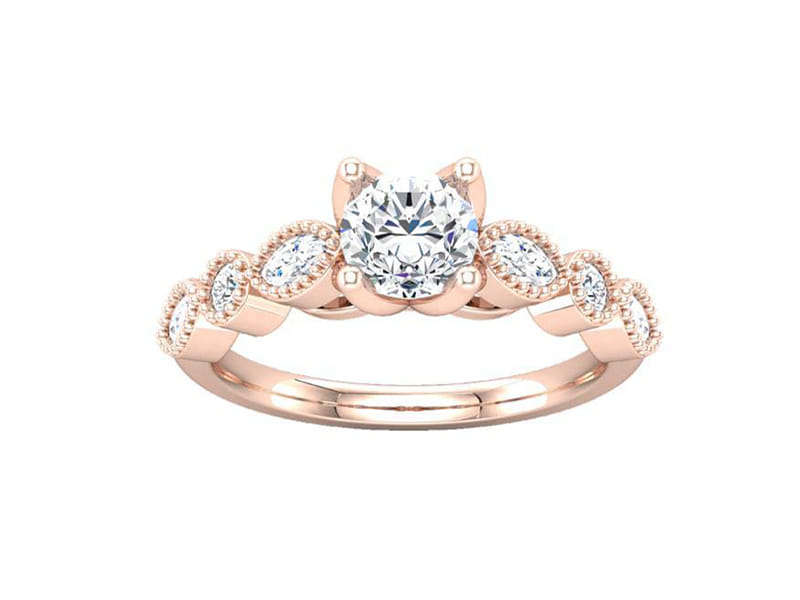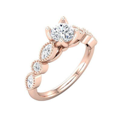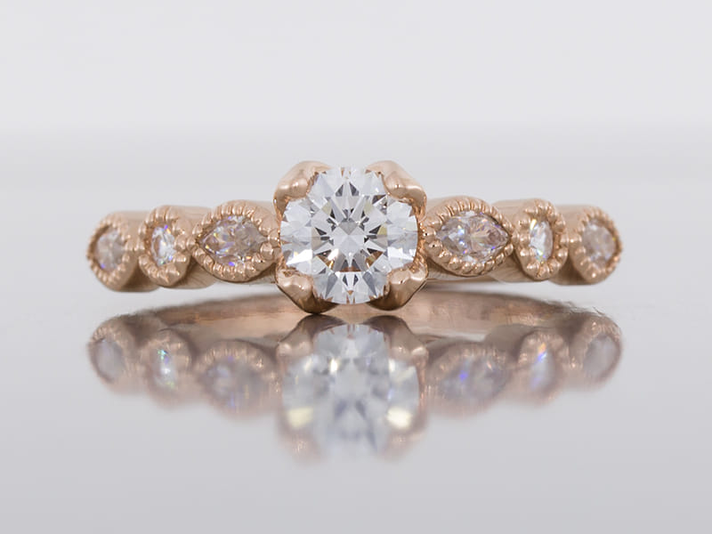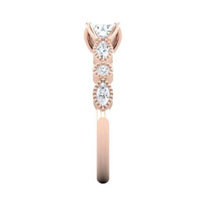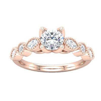 This 10k rose gold engagement ring features a diamond set in a 4 claw petal setting within a band of round and marquise shape stones with extra milgrain detailing.