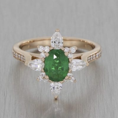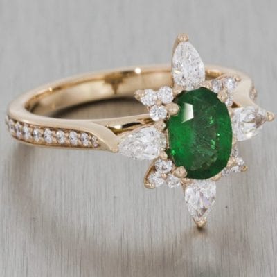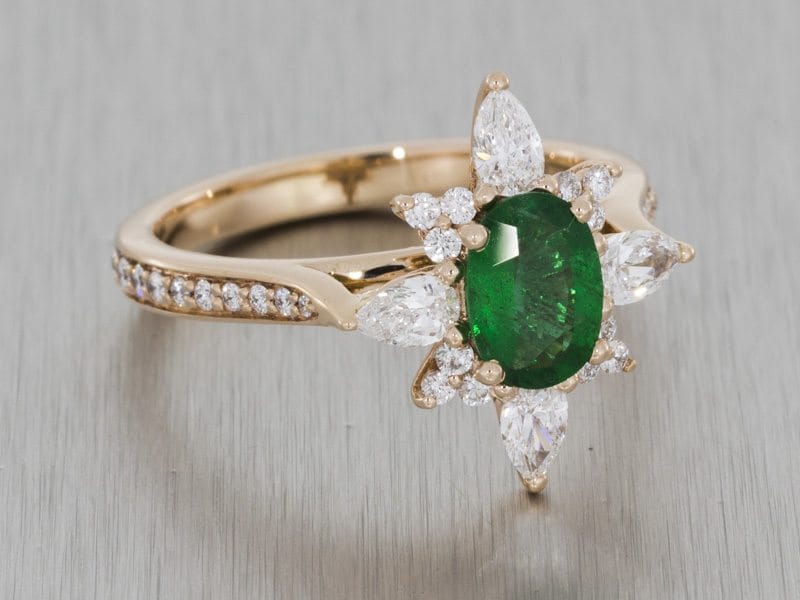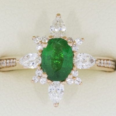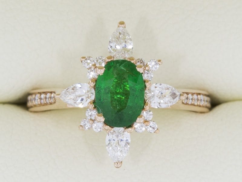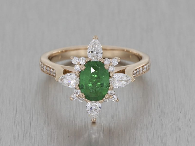 This gorgeous Gold and emerald ballerina style ring features an absolutely beautiful genuine oval emerald, surrounded by a spray of pear cut diamonds and round brilliant clusters to create the showstopping central focus of this ring. The ring shank is elegantly tapered to become the setting prong of the west and east pear cut diamonds and the custom gallery work underneath the centre array finish this bespoke engagement ring off to perfection. A truly stunning ring.