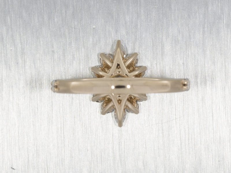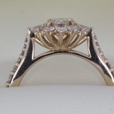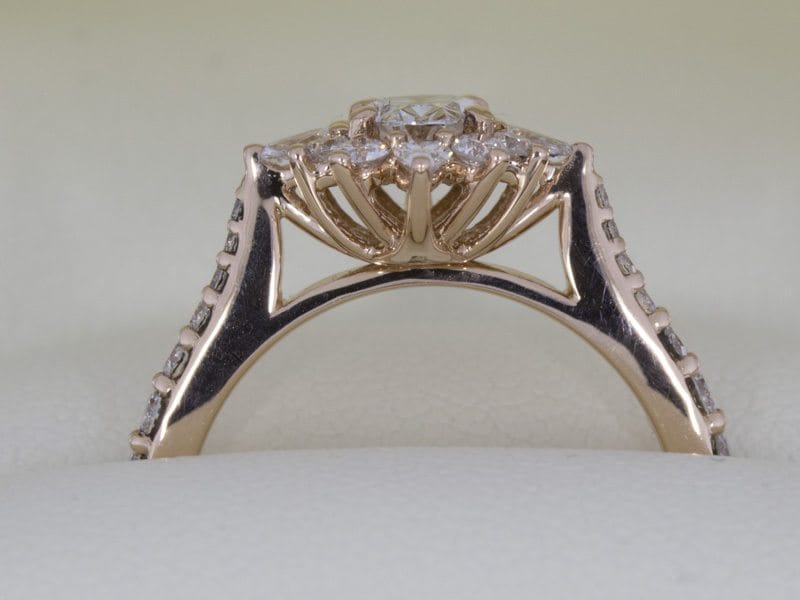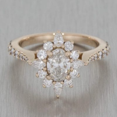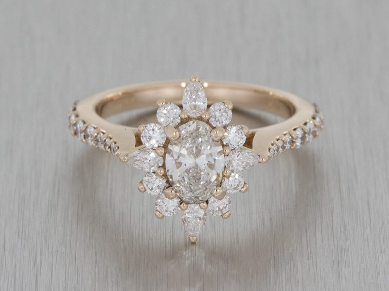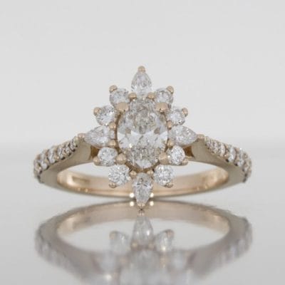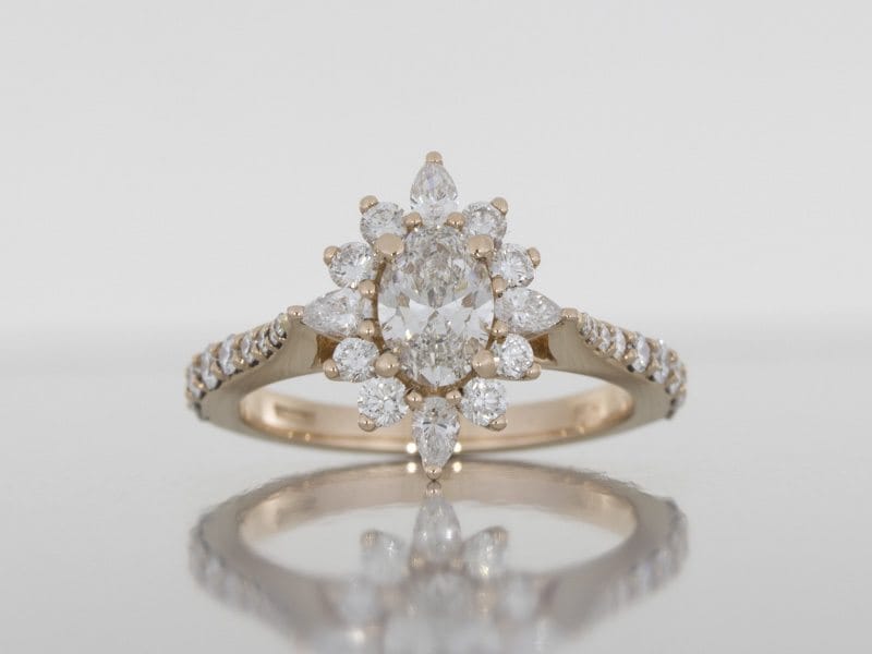 This beautiful ring style is a hybrid between a cluster ring and a ballerina ring. Rose gold was used alongside diamonds to create contrast with cathedral style shank arms tapering to become a part of the setting work for the centre array. Pear cut diamonds have been used to enhance the shape of the oval, a lab created centre diamond, for the cluster feature.
