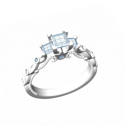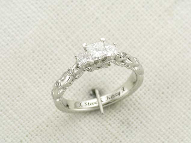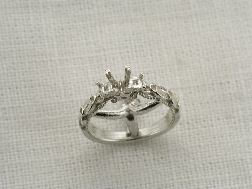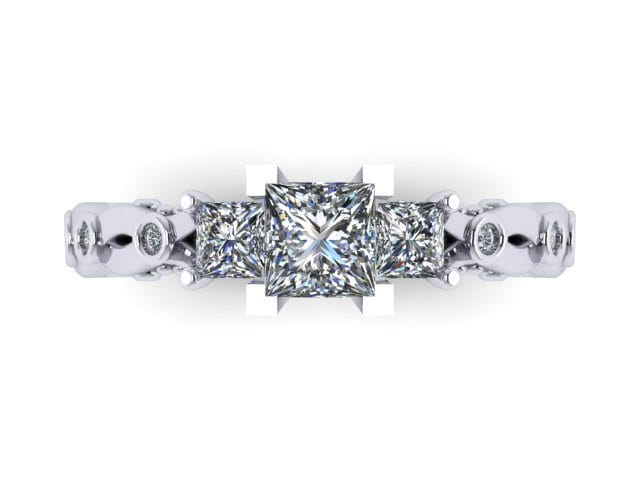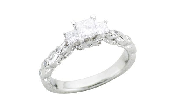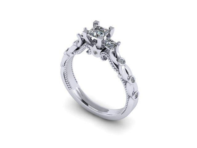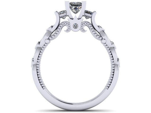 This beautiful proposal ring was inspired by the gorgeous 'Verragio' rings. There are numerous variations of this design in existence, and our client wanted to create something truly individual and unique without loosing the impact of the incredible designed features. The band in itself is not just an extension of the diamonds, but also an integral prominent feature. In the centre we decided to leave the plated arms plain which enables you to see each detail clearly. We incorporated accent diamonds into the plated section using the bezel setting, allowing these to become additional design features. The three diamonds in the centre were raised to emphasise the ring's dramatic atmosphere. The swirls are set apart perfectly by the milgrain adding more detail to the piece. The centre princess cut diamond features four corner claws to emphasise the shape, whereas the two side stones are softer and incorporated into the band.