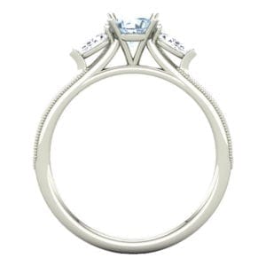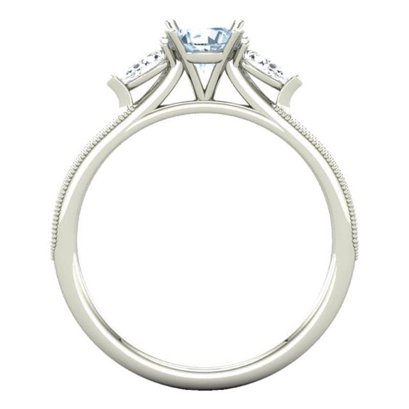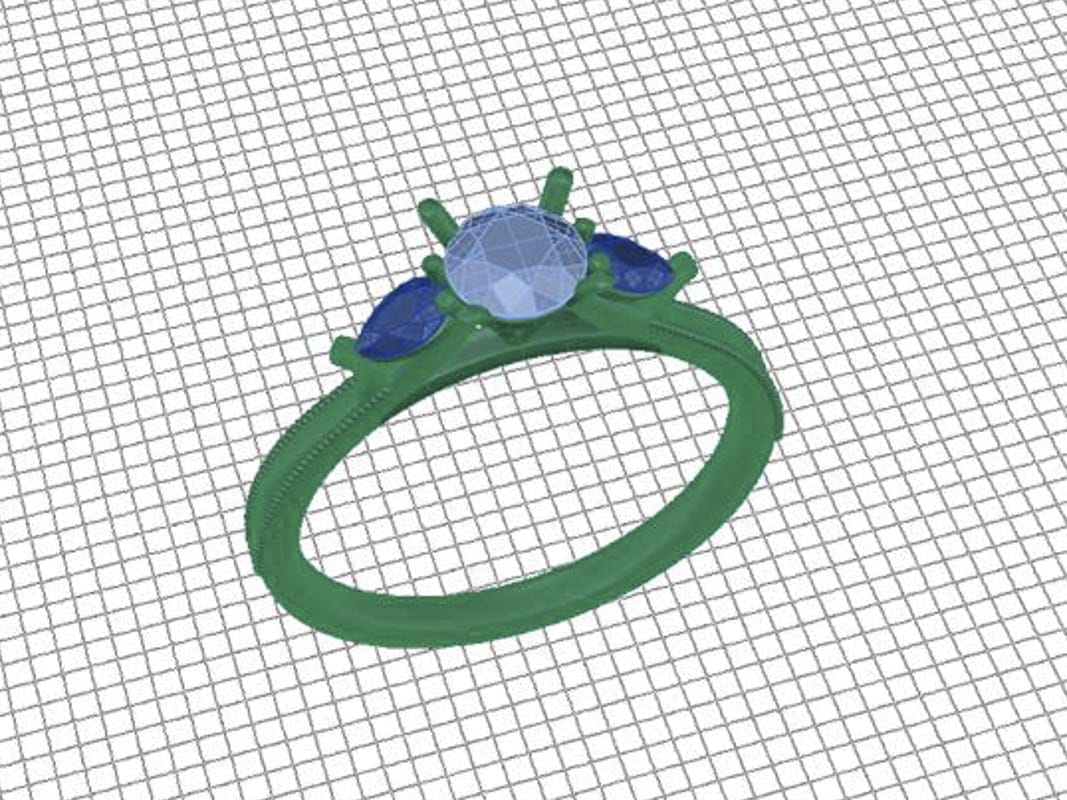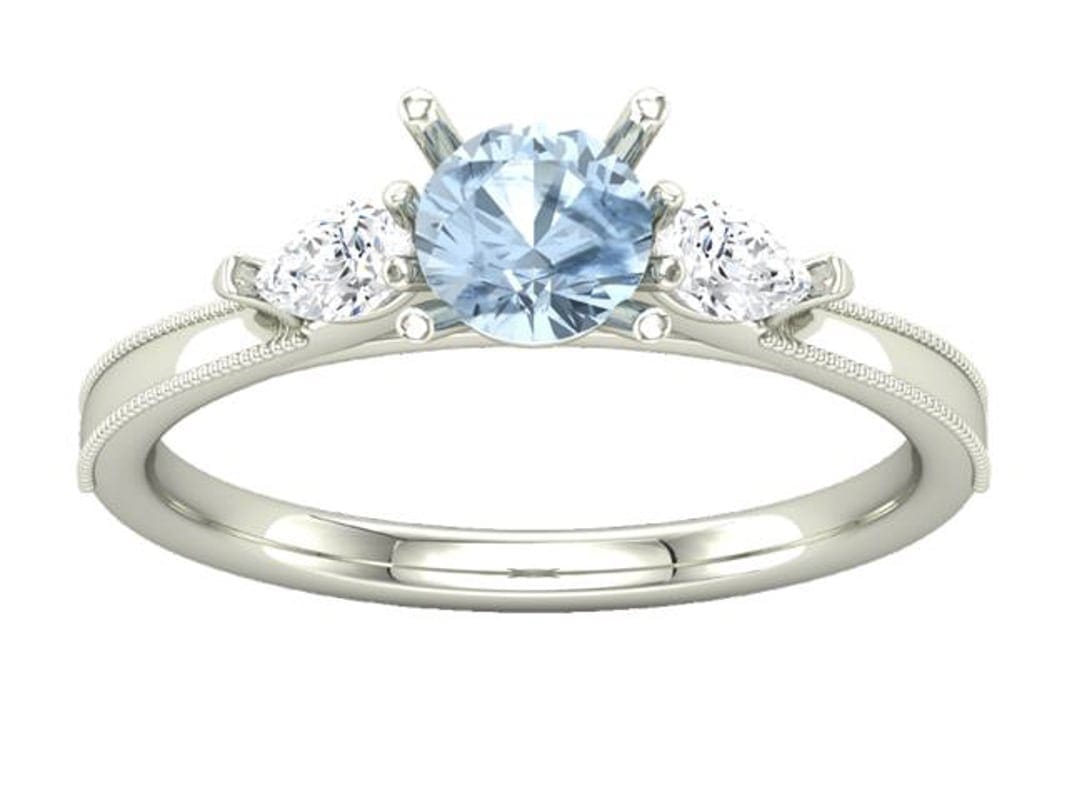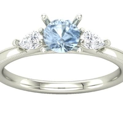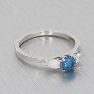 A Distinct Three Stone Ring Featuring A magnificent treated blue diamond, framed With white Pear Shaped Diamonds. The band is elegantly finished with soft beaded edges. A beautifully classic piece identified with that personal touch.