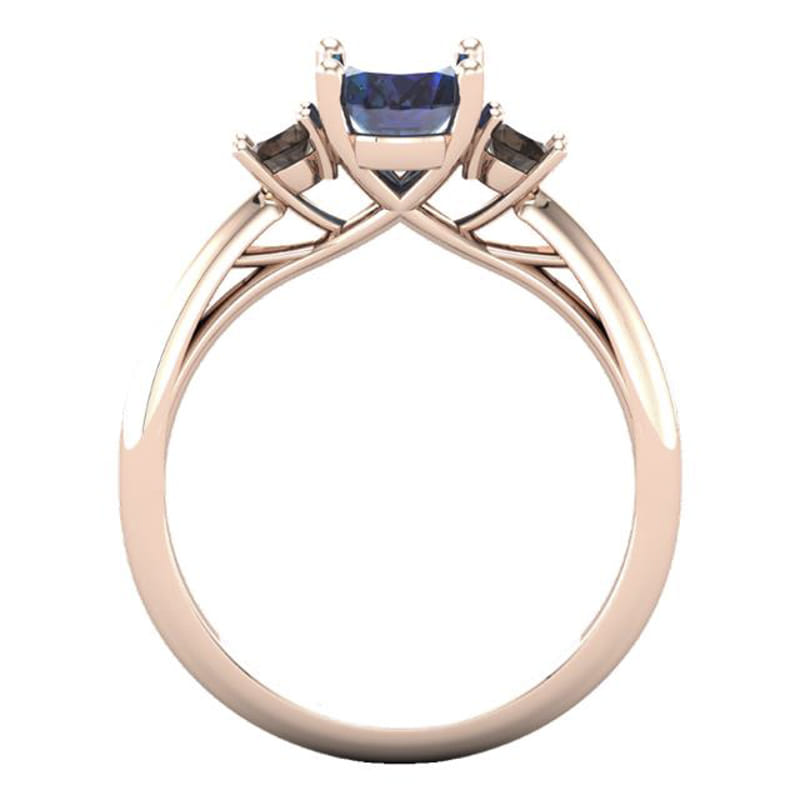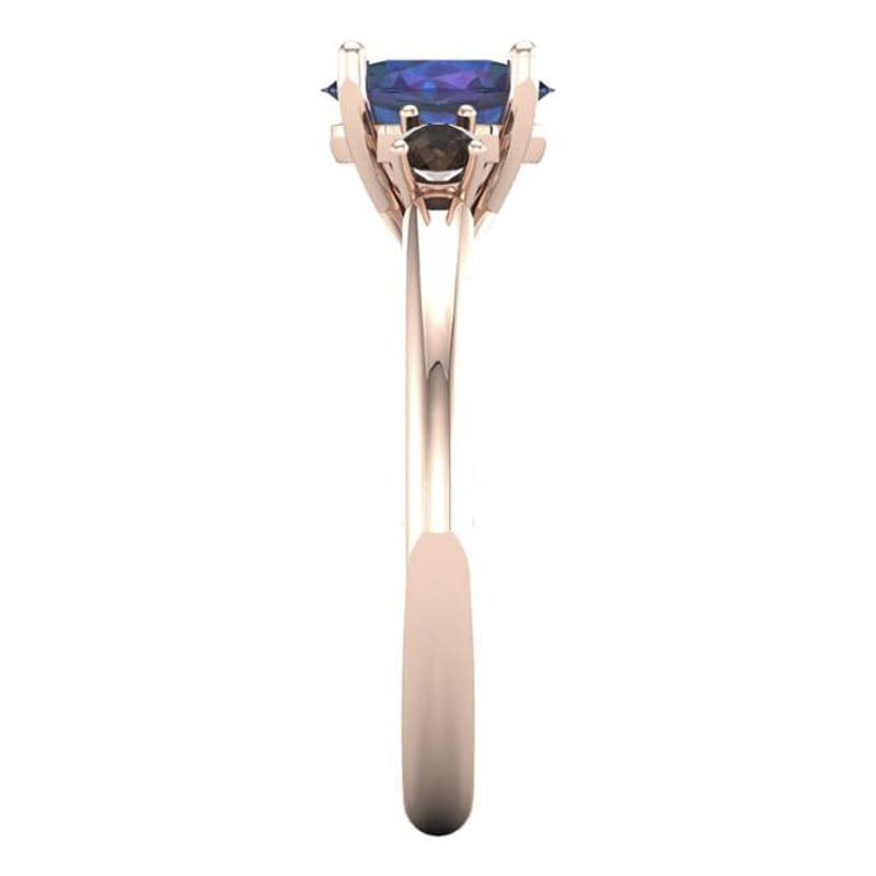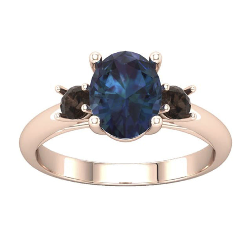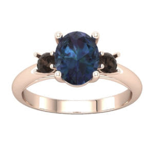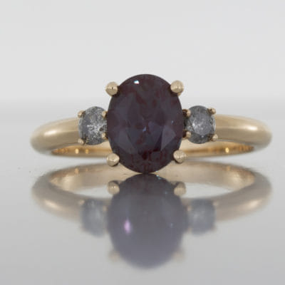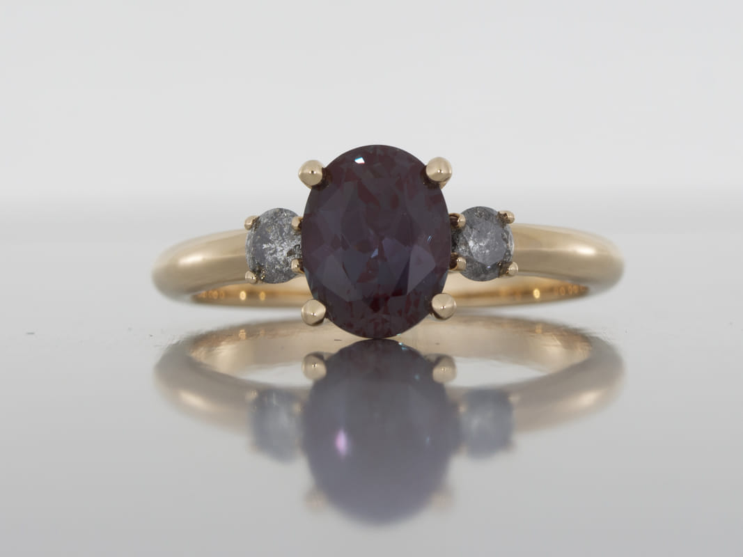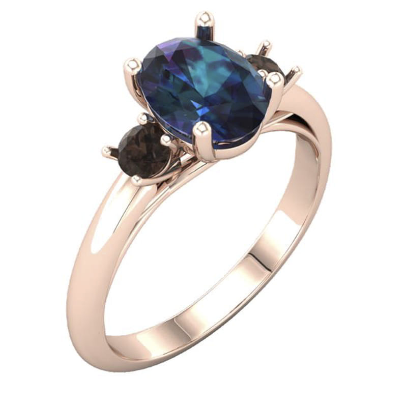 This contemporary engagement ring has been crafted in 18k rose gold set with an awe-inspiring lab-grown oval Alexandrite in the centre with two smaller round salt & pepper diamonds on either side. The setting for the three stones has been constructed to be a subtle nod to the Art deco era using clean and simple lines.