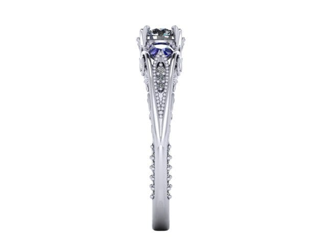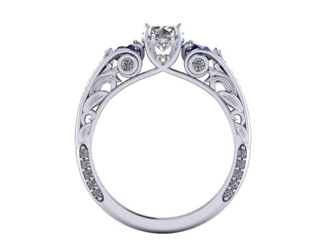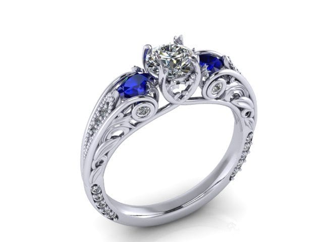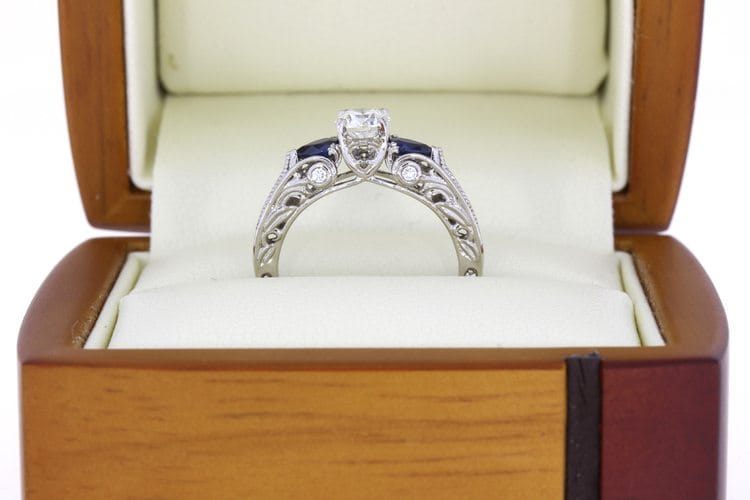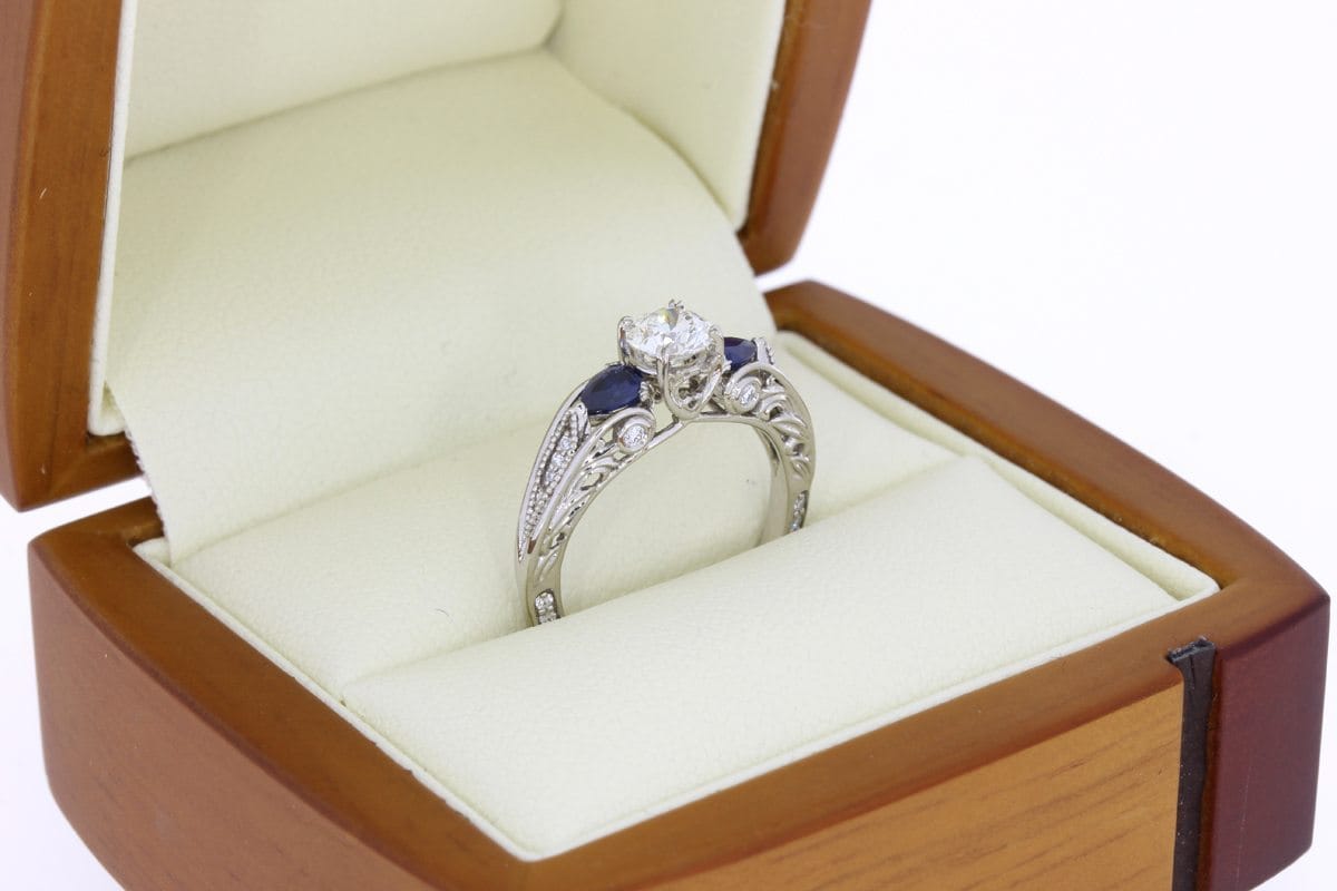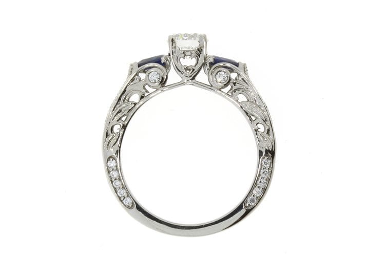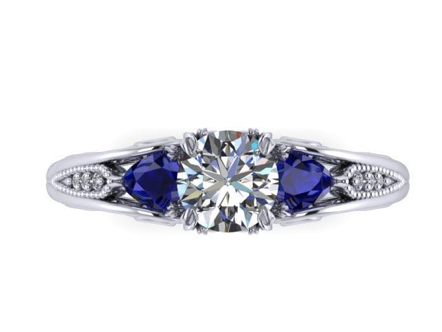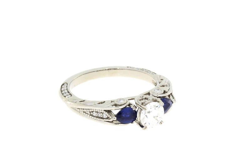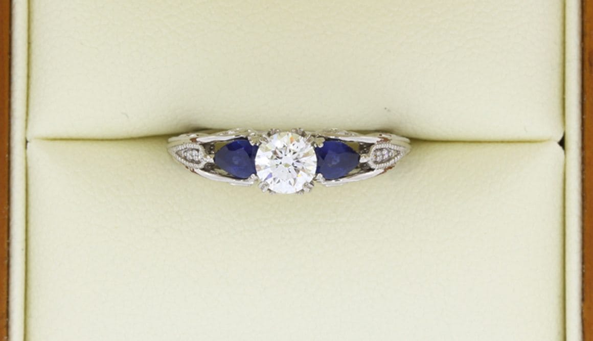 For this project our client requested a ring that would be timeless and meticulously designed. To achieve this we used a round brilliant centre white Diamond flanked by two pear cut blue Sapphires to create a trilogy design element. The beautiful stones were then set on a Palladium ring to achieve a comfortable wear and to meet the client's budgetary needs. We were delighted with the spectacular finish of this beautiful, vintage inspired engagement ring. It has a timeless, organic style that our client adored.