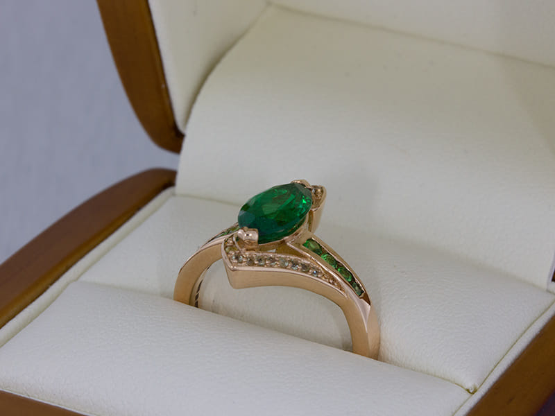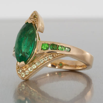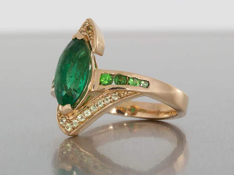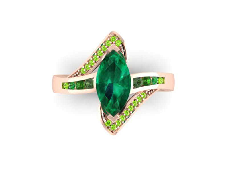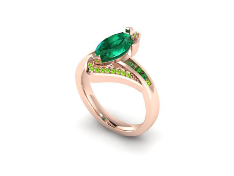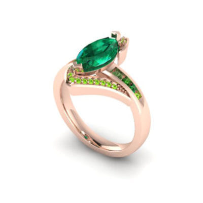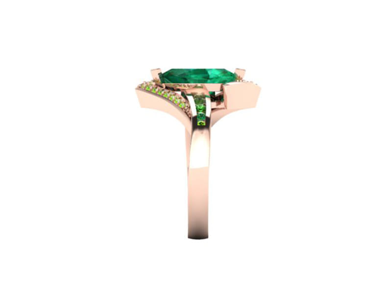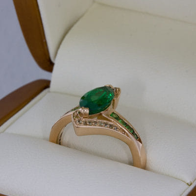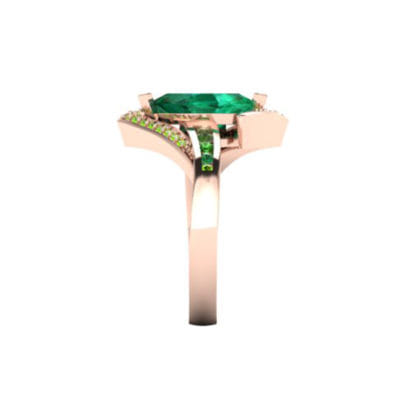Our client came to us with a very clear ideas of what he was looking to create. Having seen a similar ring which he used as a source of inspiration we worked with our client to create this beautiful unique design perfect for his partner. He sourced the stones himself and was looking to create a ring that was bold and created an impact. The additional stone set arms bring balance in the ring encompassing the centre stone without detracting the attention from the beautiful emerald marquise centre.