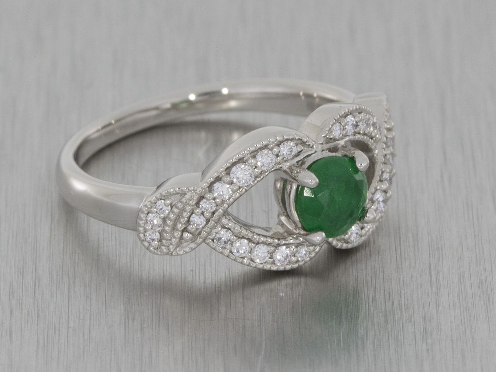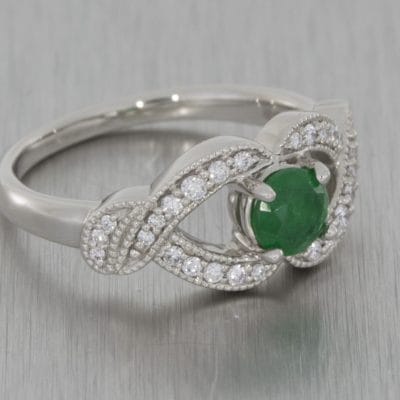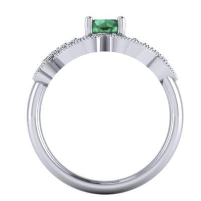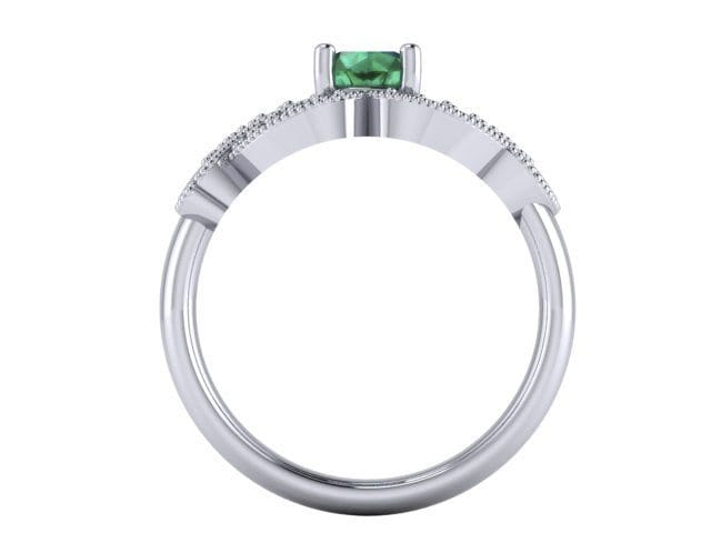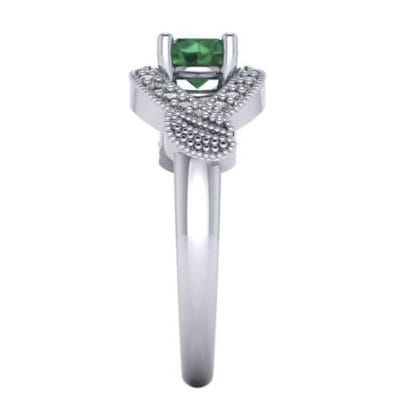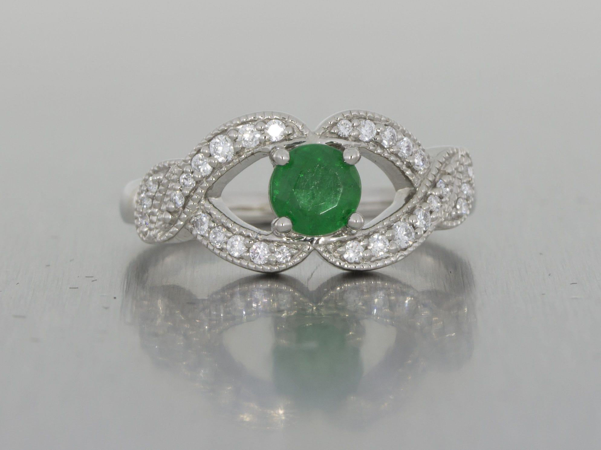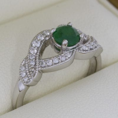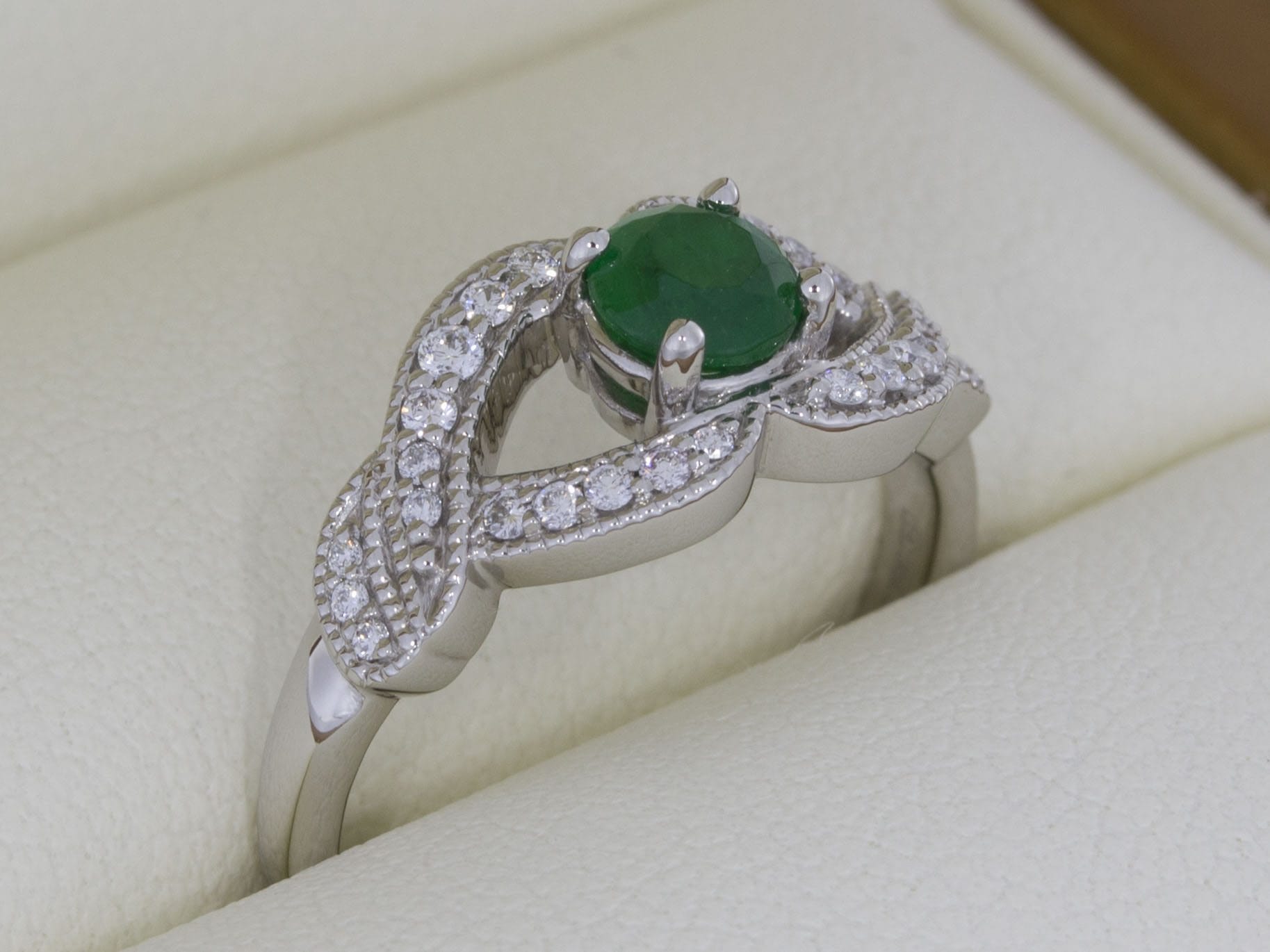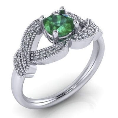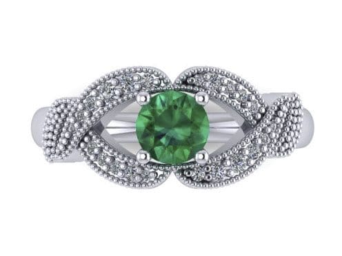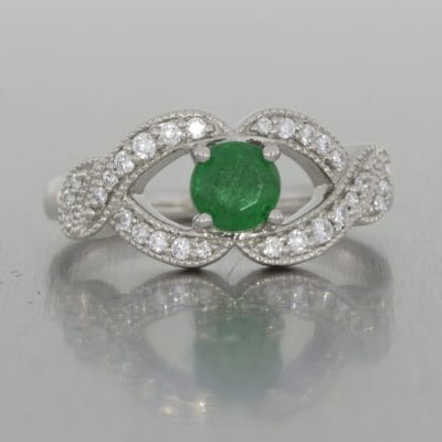 This Victorian inspired ring design features a round emerald with beautifully sculpted shoulders set with round brilliant grain set diamond.