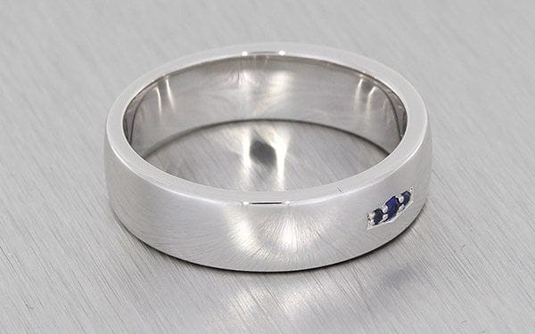 A Bold white gold, 6 mm soft courted band set with graduating round sapphires. The ring is completed with a polished finish.