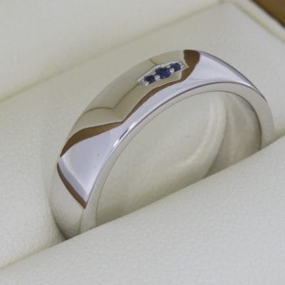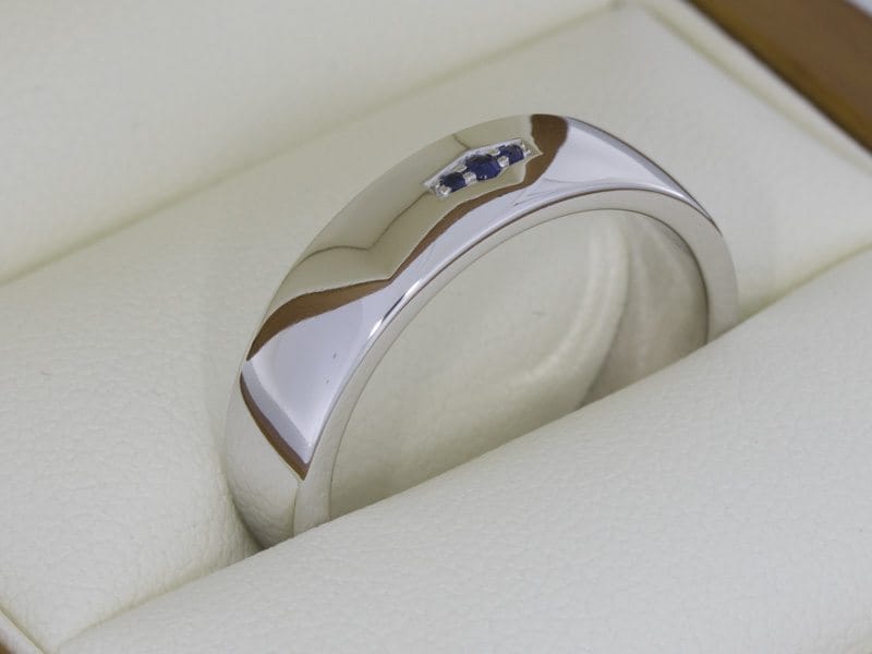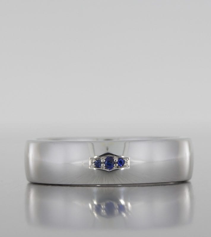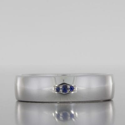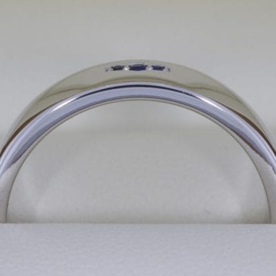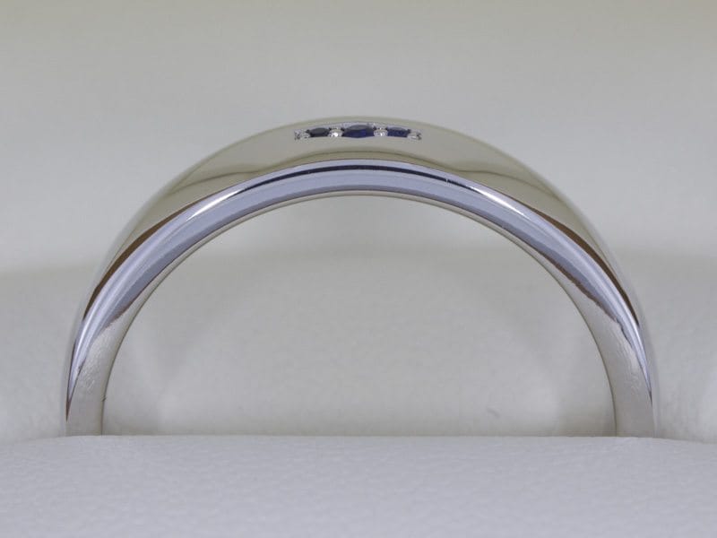 A Bold white gold, 6 mm soft courted band set with graduating round sapphires. The ring is completed with a polished finish.