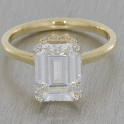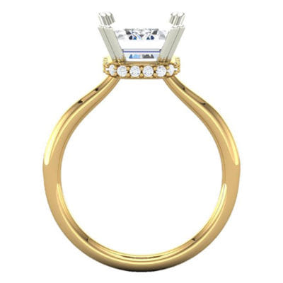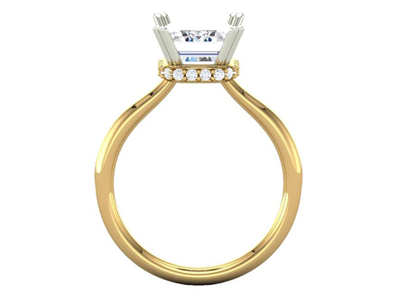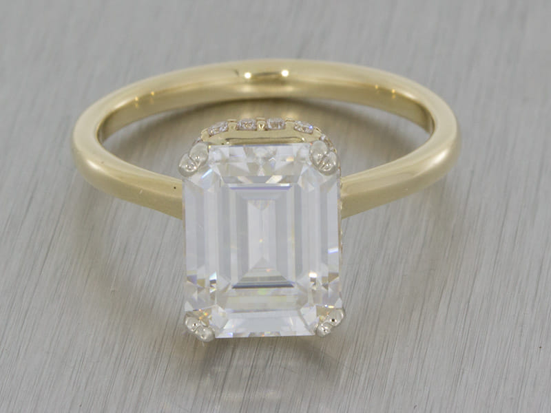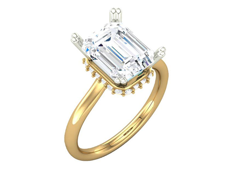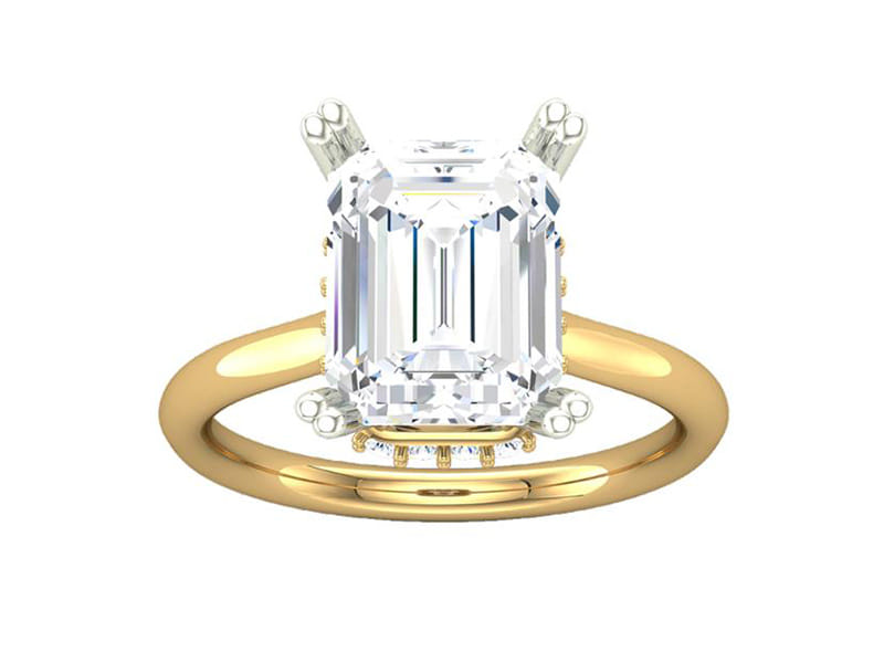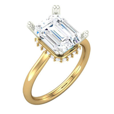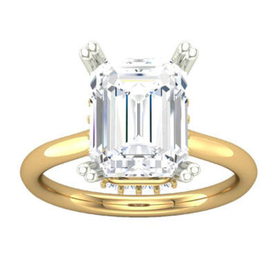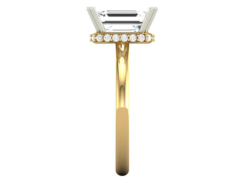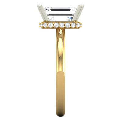 An elegant and classic solitaire engagement ring with a unique, modern twist. Featuring a lowered side halo sitting below the striking emerald cut moissanite. The centre stone set in white gold claws with the halo and ring band in yellow gold. The contrast in metals, highlighting the contemporary feel to this outstanding ring.